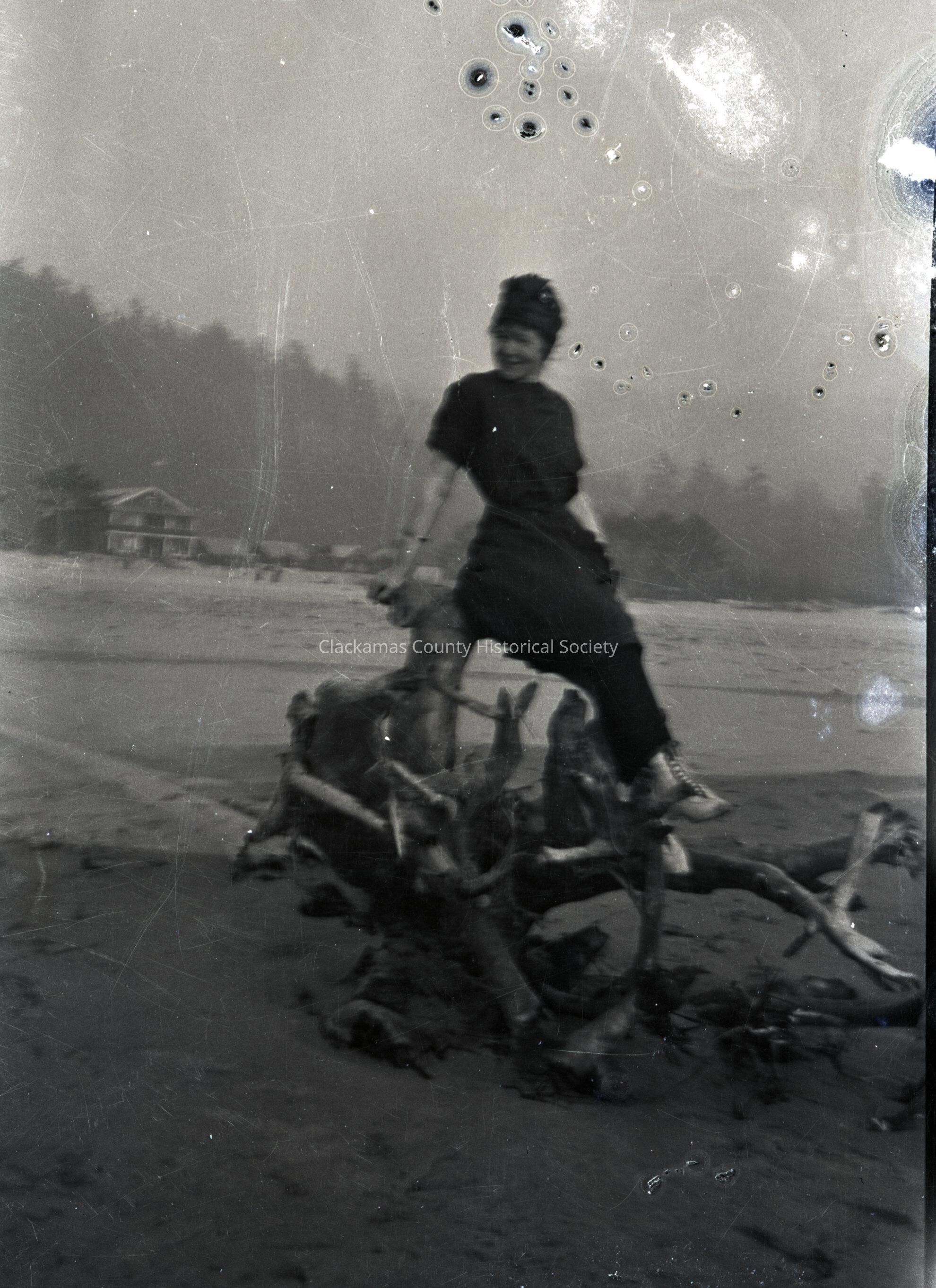 Woman seated on driftwood at beach. (envelope unmarked)Made/Created
