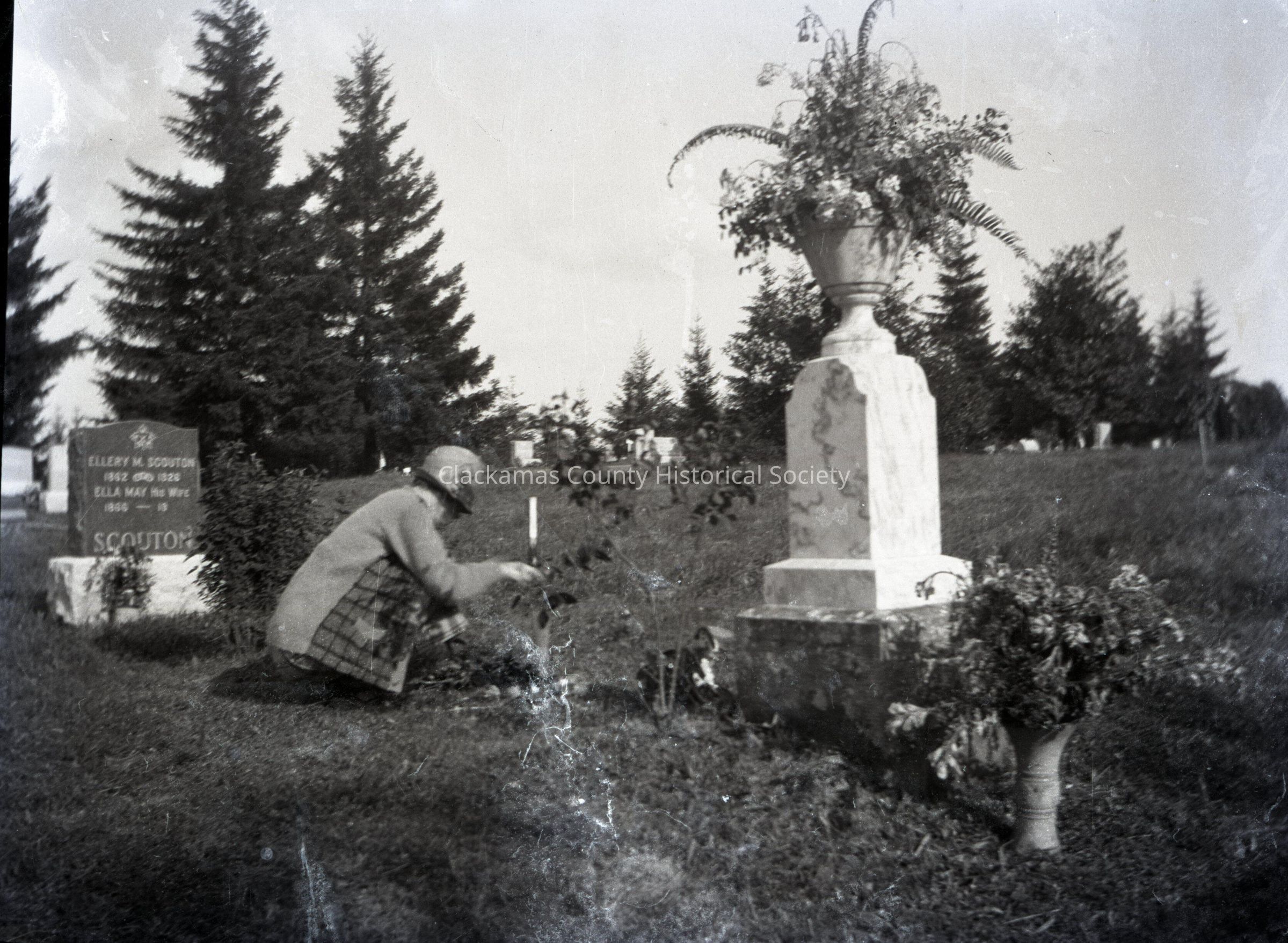 Woman with flowers at Mountain View Cemetery.Made/Created