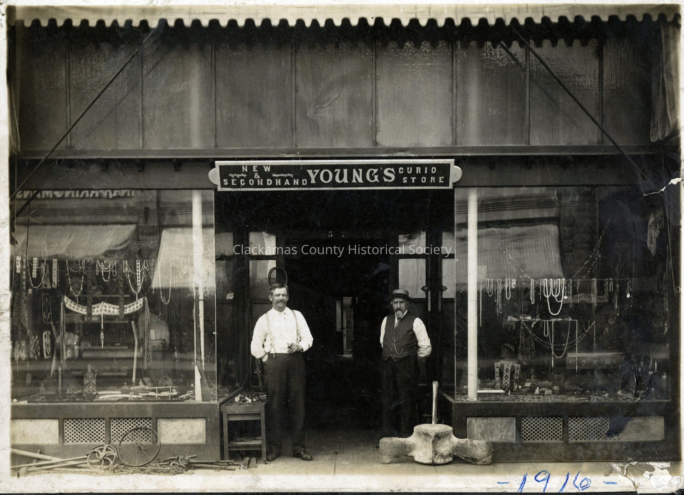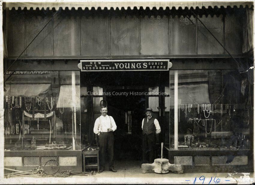 Young's New and Used Secondhand Curio Store. 507 Main Street, Oregon City, Oregon. George H. Young on left without hat. Ray Young is presumably on the right. The store's site later became the Coast to Coast Store.Made/Created