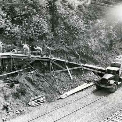 Workers with Truck Transporting Steel Girders, I-205 Bridge Construction.
