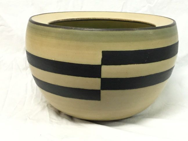 Large bowl stoneware (cream with dark circling stripes, greenish interior)