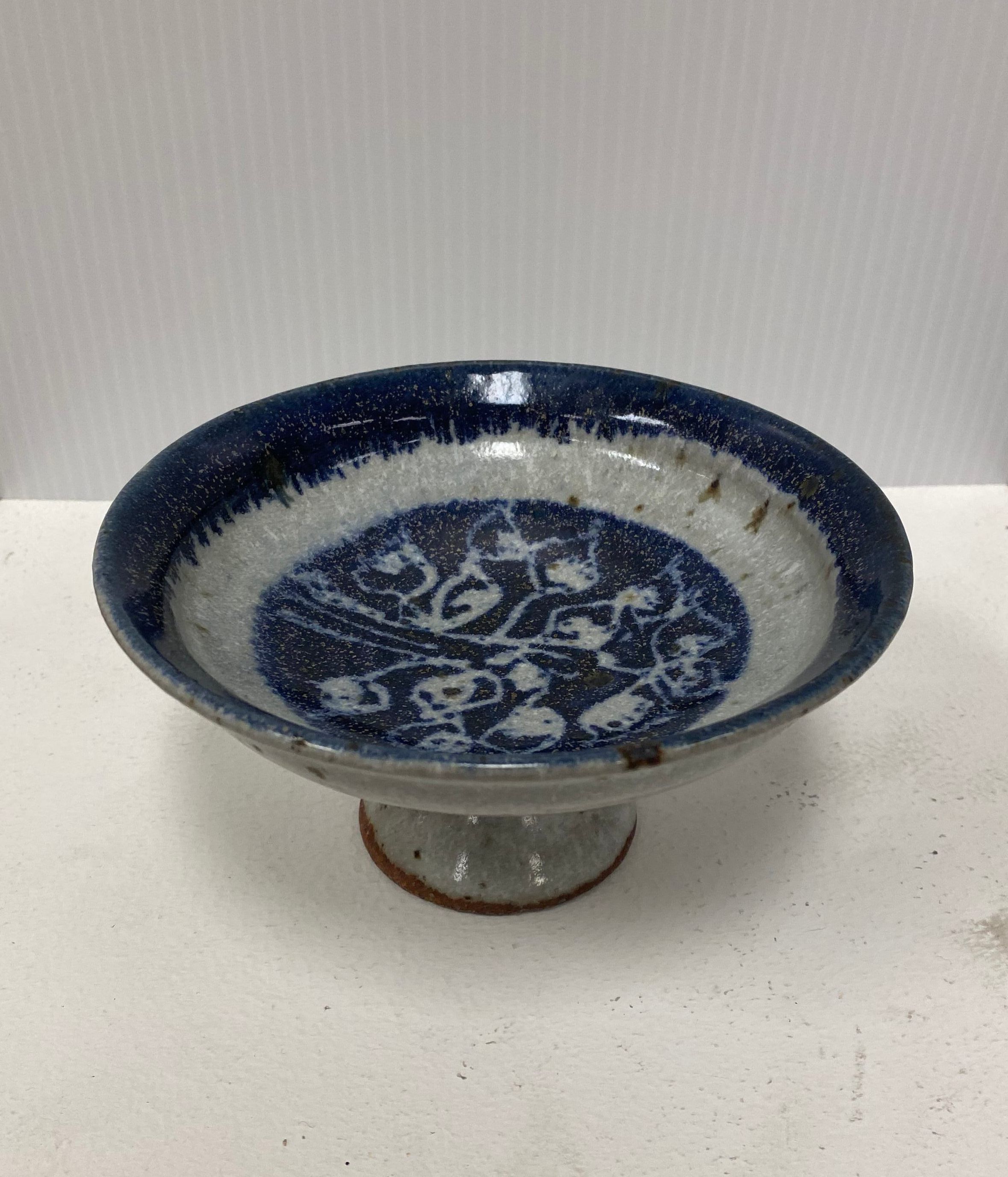 Earthenware (brown clay body, light gray glaze with a dark blue rim and center of the bowl. Wax resist plant decoration in bowl)