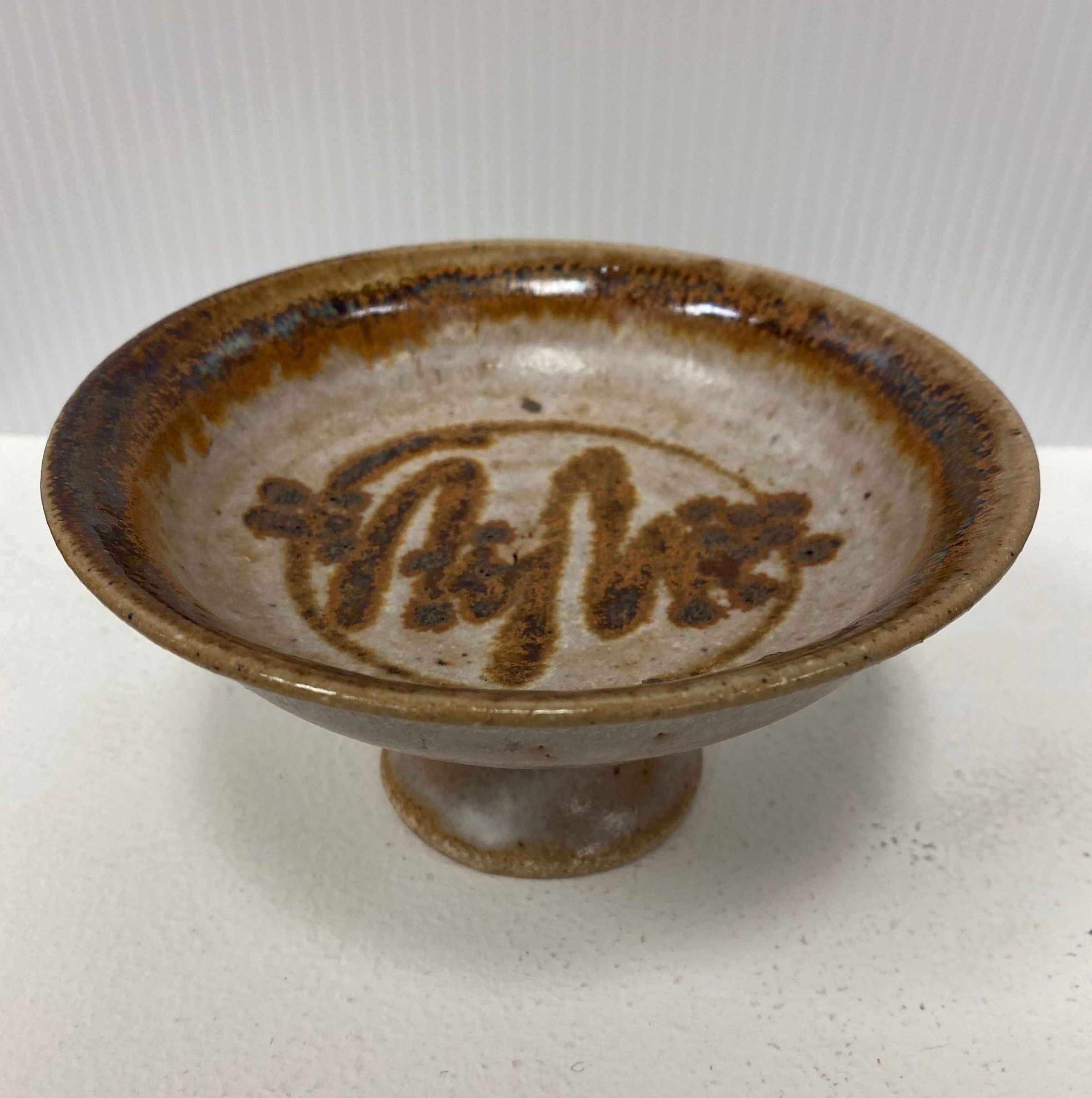 (Brown clay body with light sand color glaze with a dark brown rim. Inside the compote is a wax-resist decoration in dark brown)