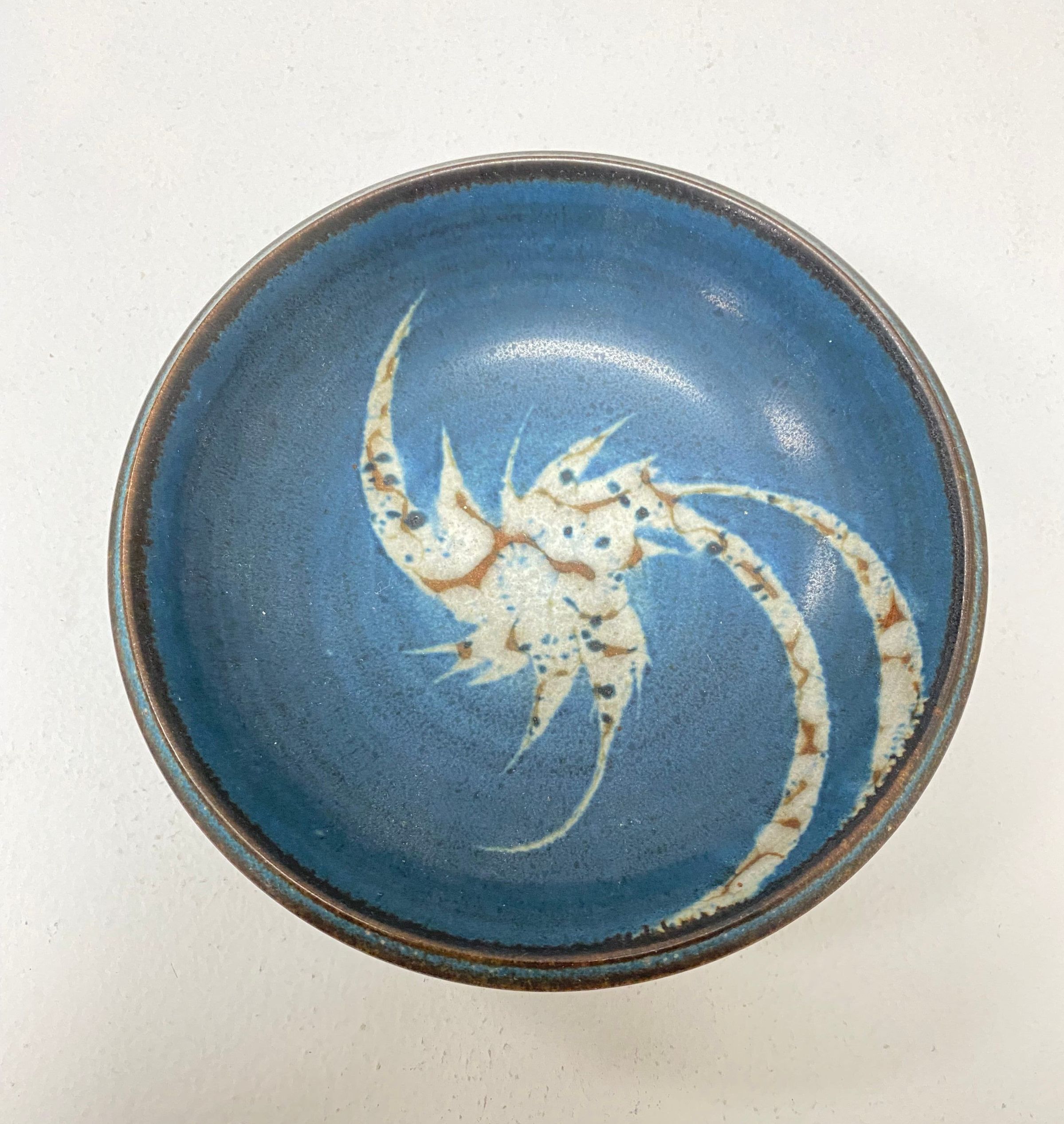 blue engobe with wax resist brushed swirl