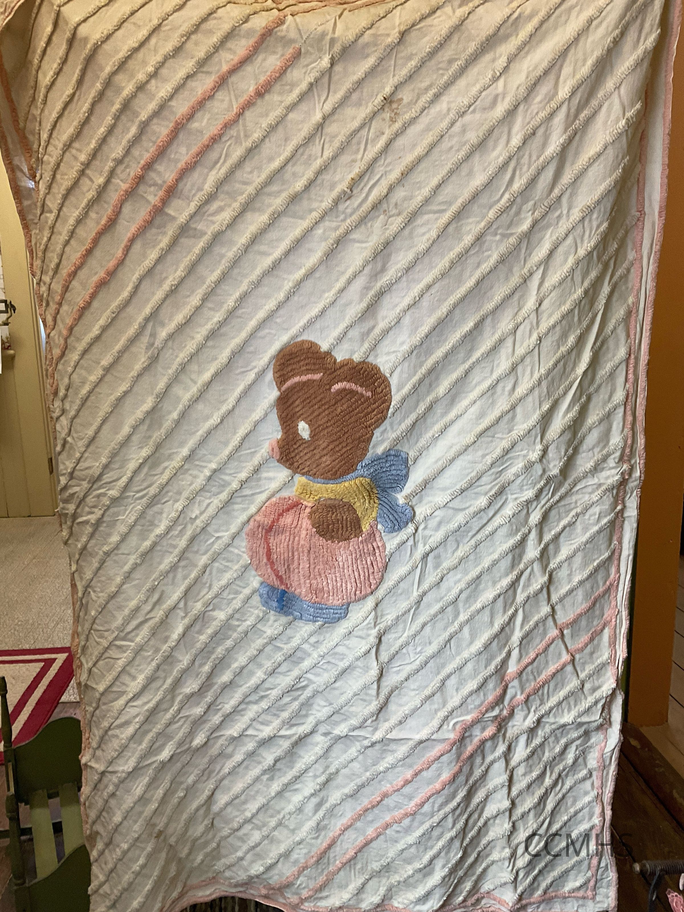 White baby bedspread with white chenille diagonal stripes and a brown, pink, blue and yellow chenille bear in the center.