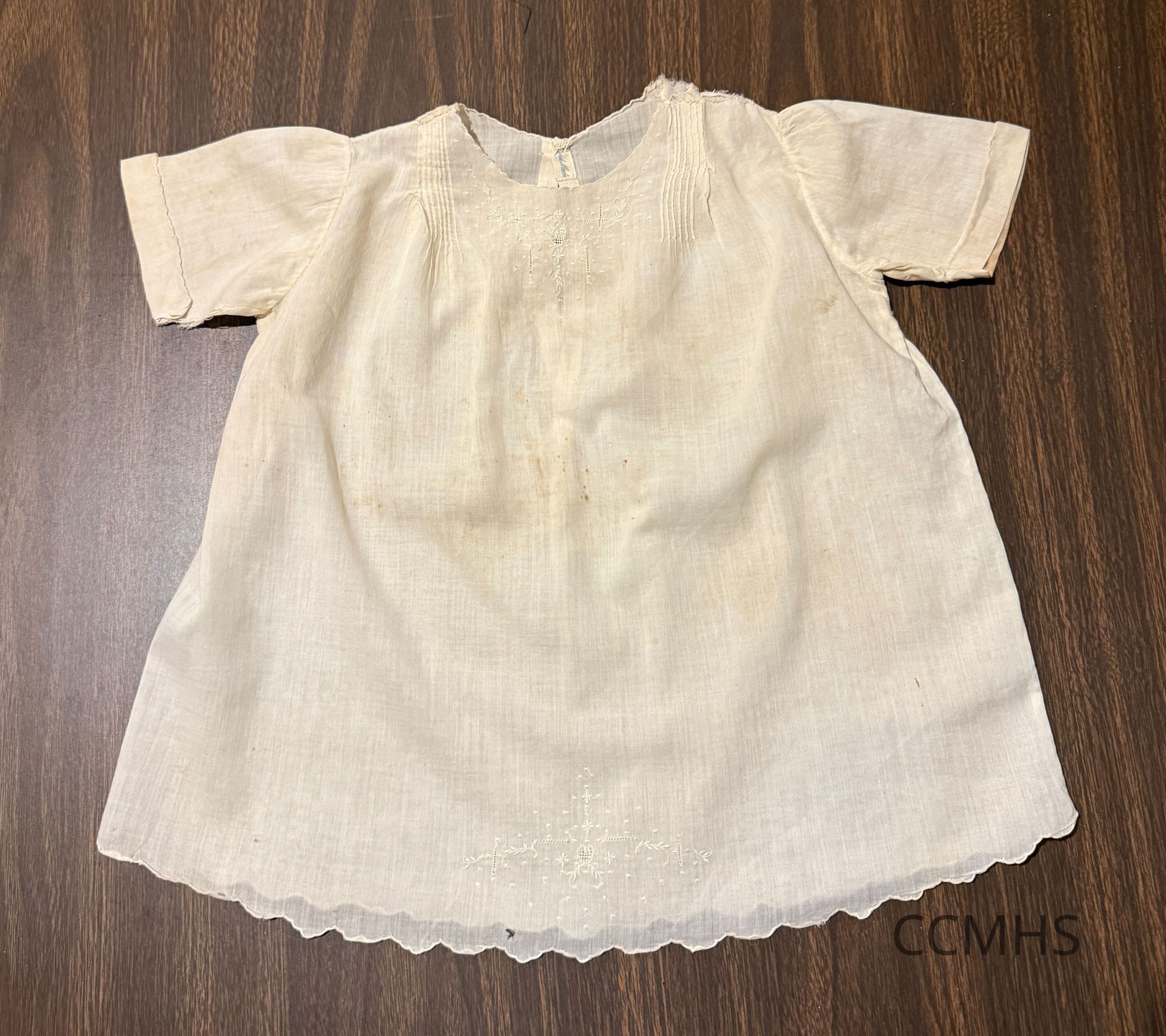 White baby dress with scalloped bottom edge.
