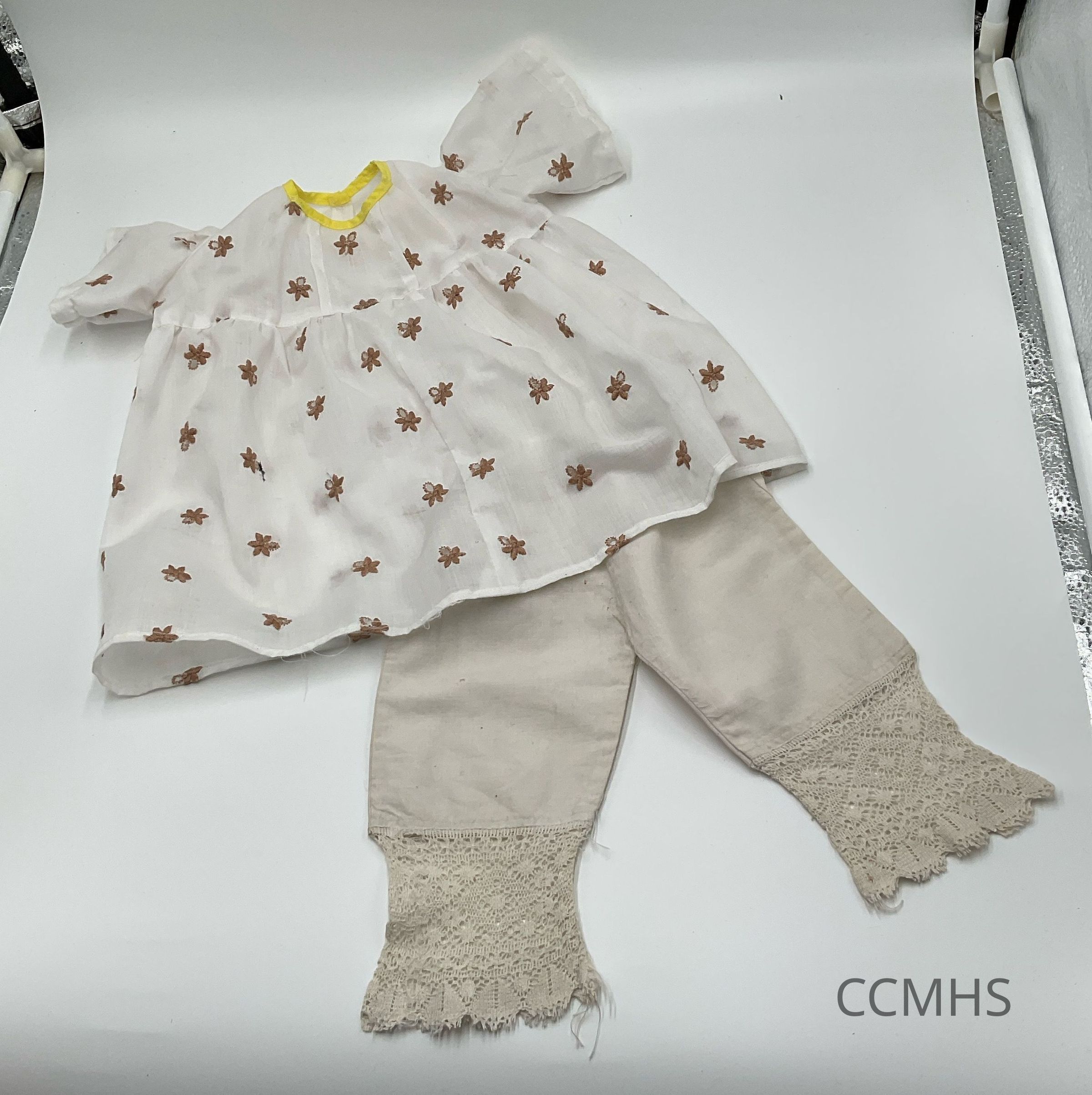 White shirt with yellow collar and embroidered brown flowers, white pants with lace ankles.