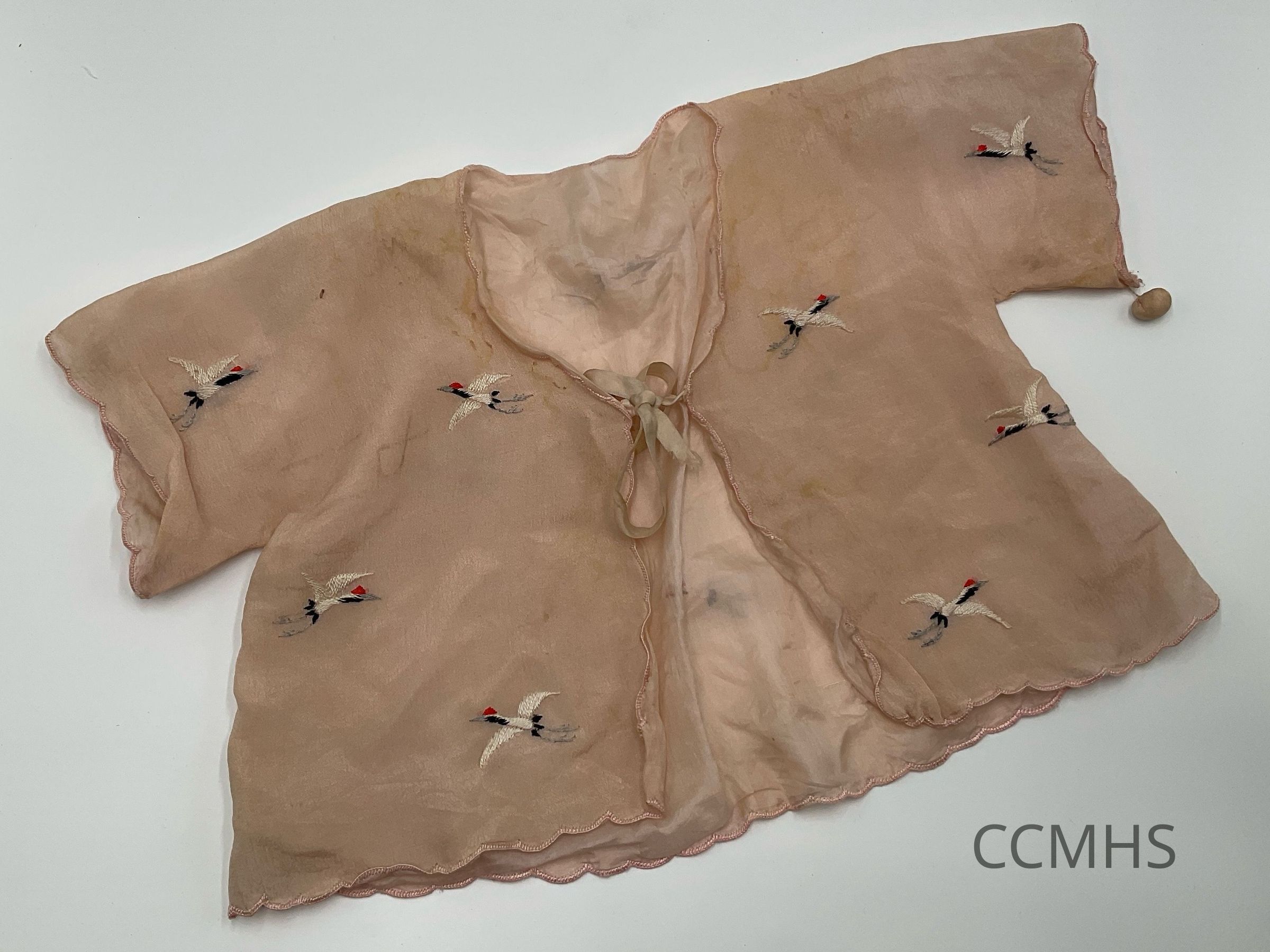 Light pink, short-sleeved jacket with embroidered cranes and a single ribbon tie in the front.