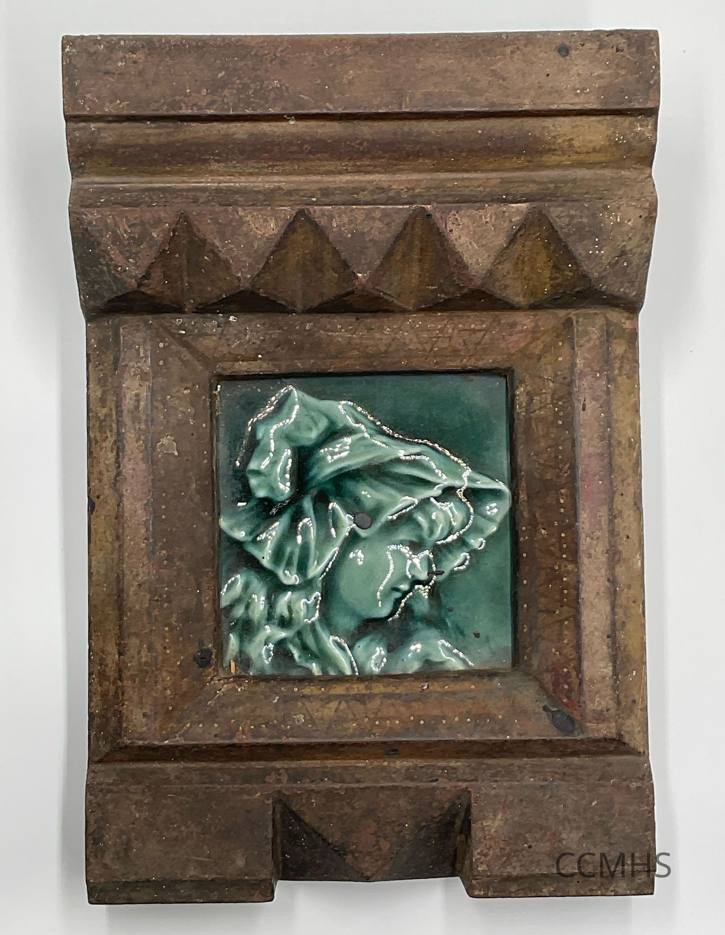 Green-glazed ceramic tile with an image of a woman wearing a bonnet in relief.