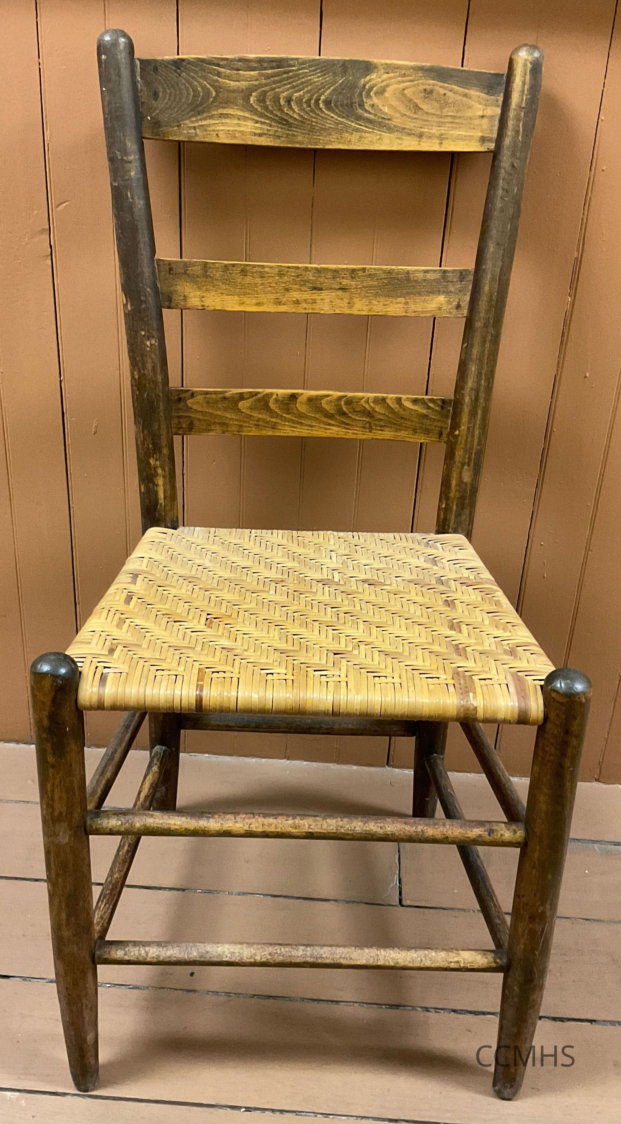 Slat back chair with wicker seat.