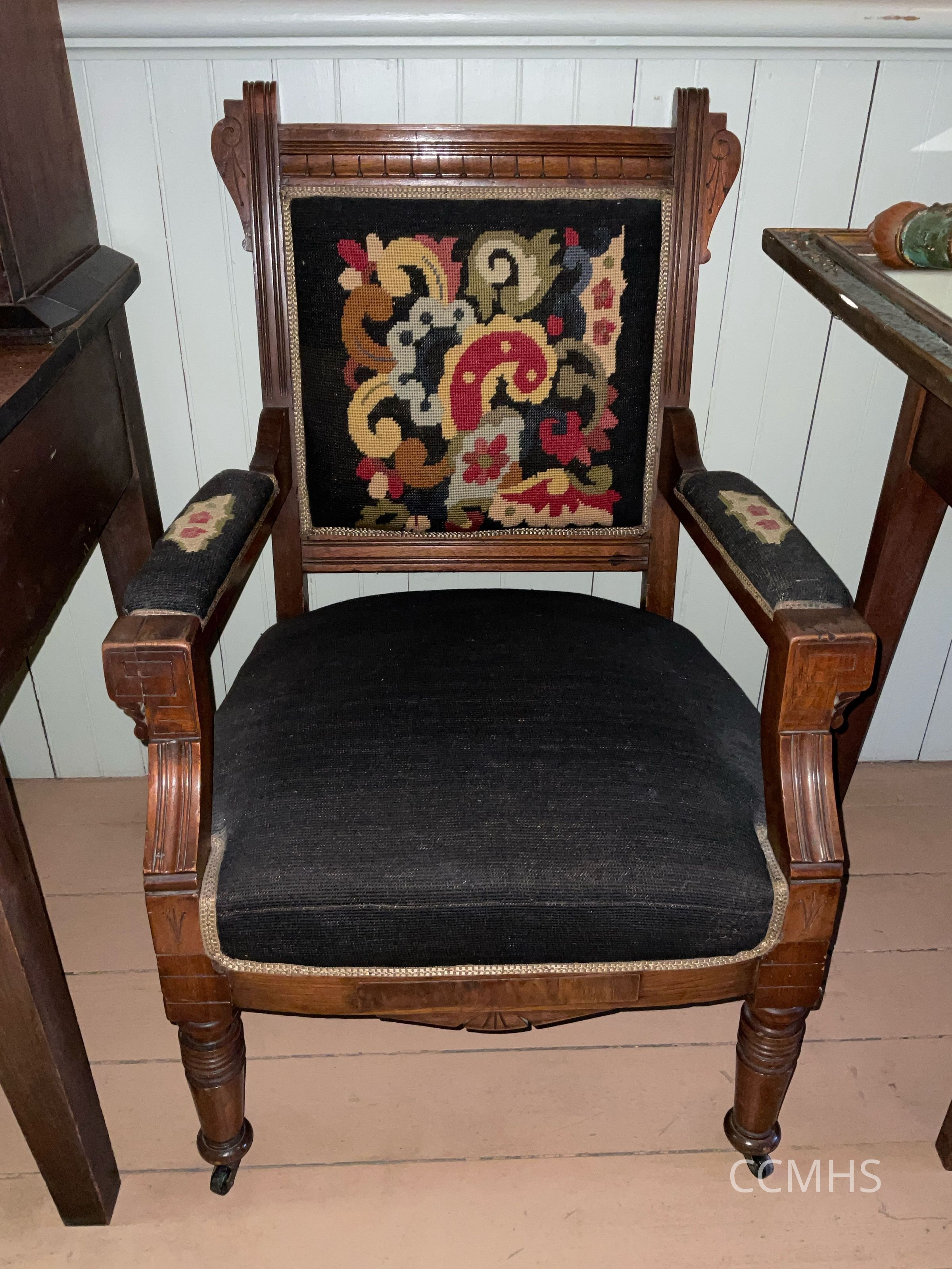 Armchair with wood frame and upholstered armrests, back and seat. Armrests and back include needlepoint designs.
