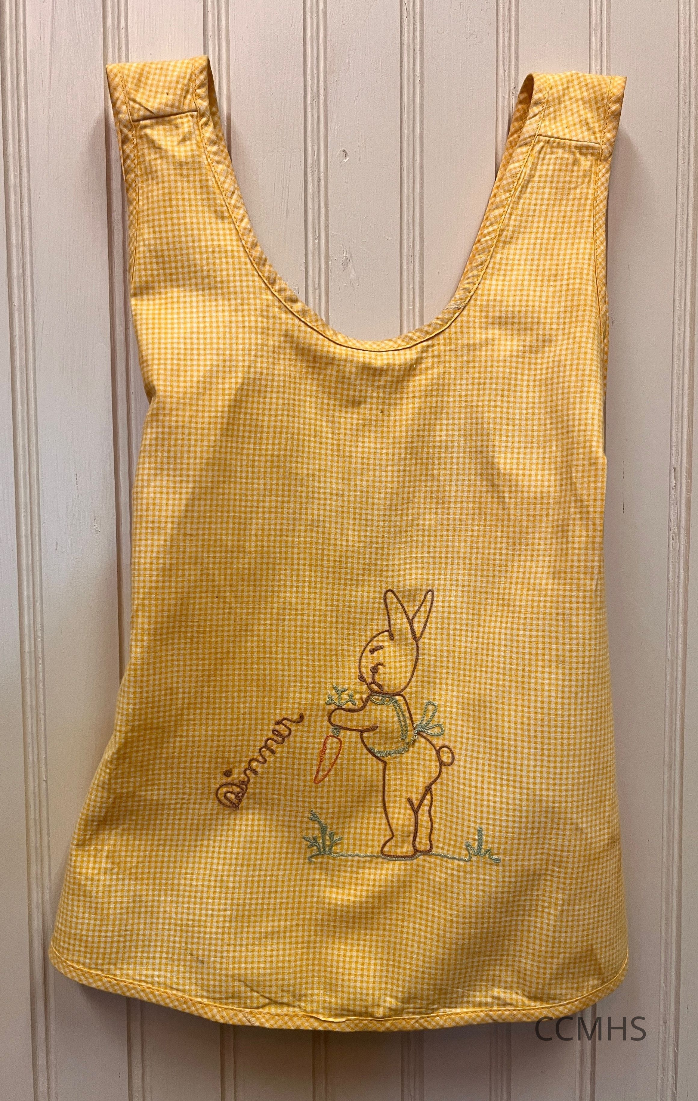 Yellow tank top with a rabbit holding a carrot stitched on the front.
