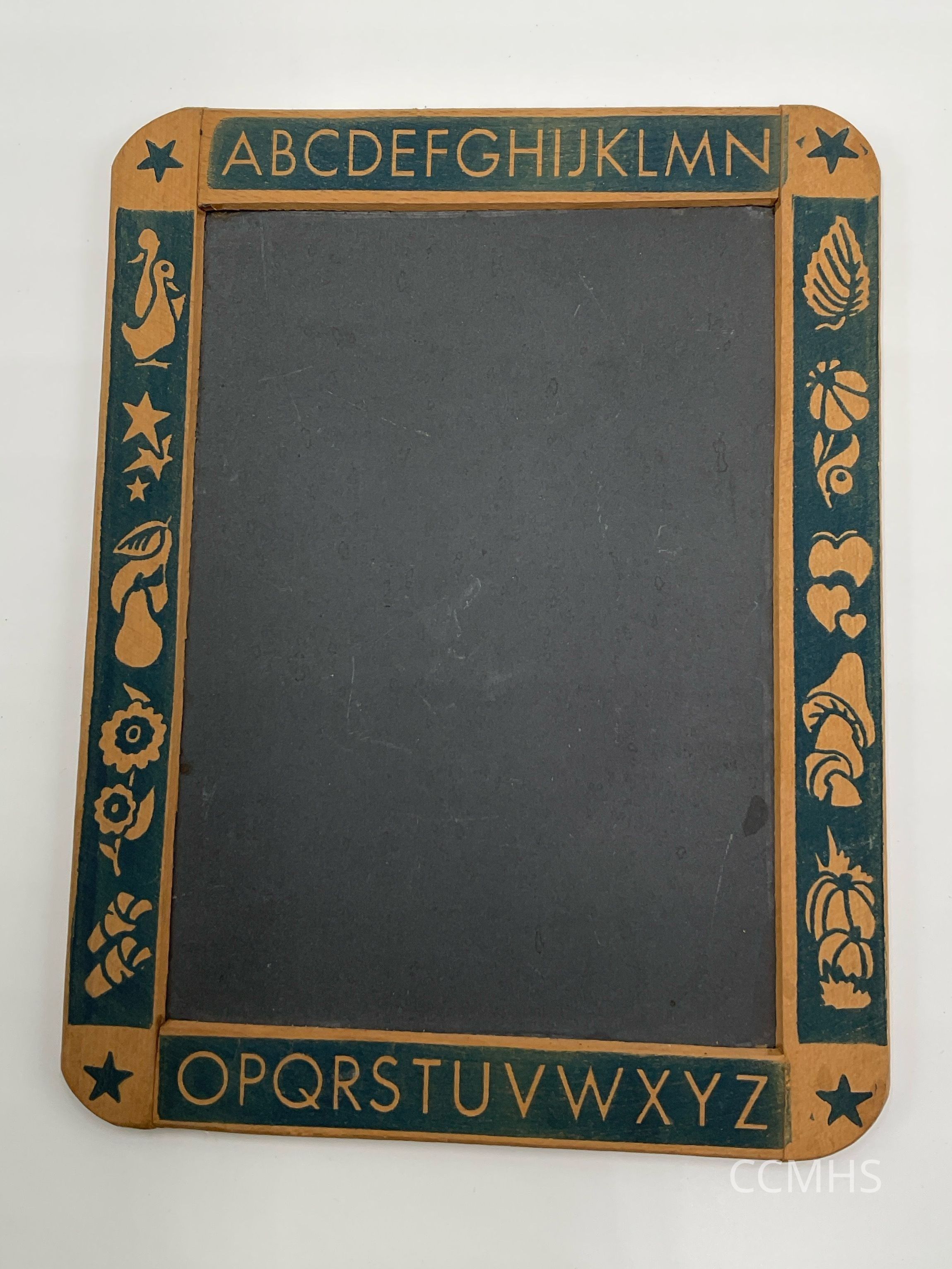 Child’s personal chalkboard, framed in wood printed with the alphabet and nature images.