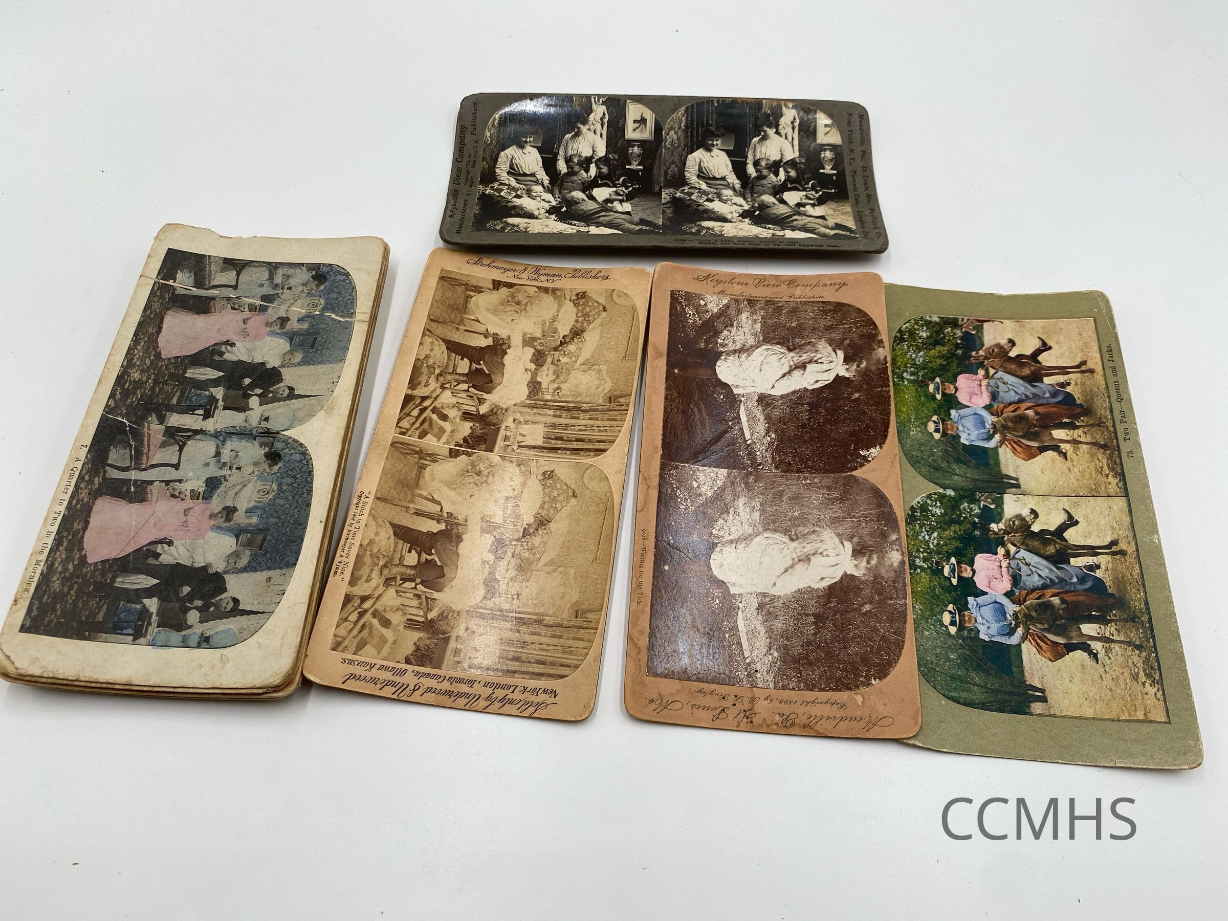 Each card includes two photographs side-by-side. When viewed through a stereoscope, the viewer sees a three-dimensional image.