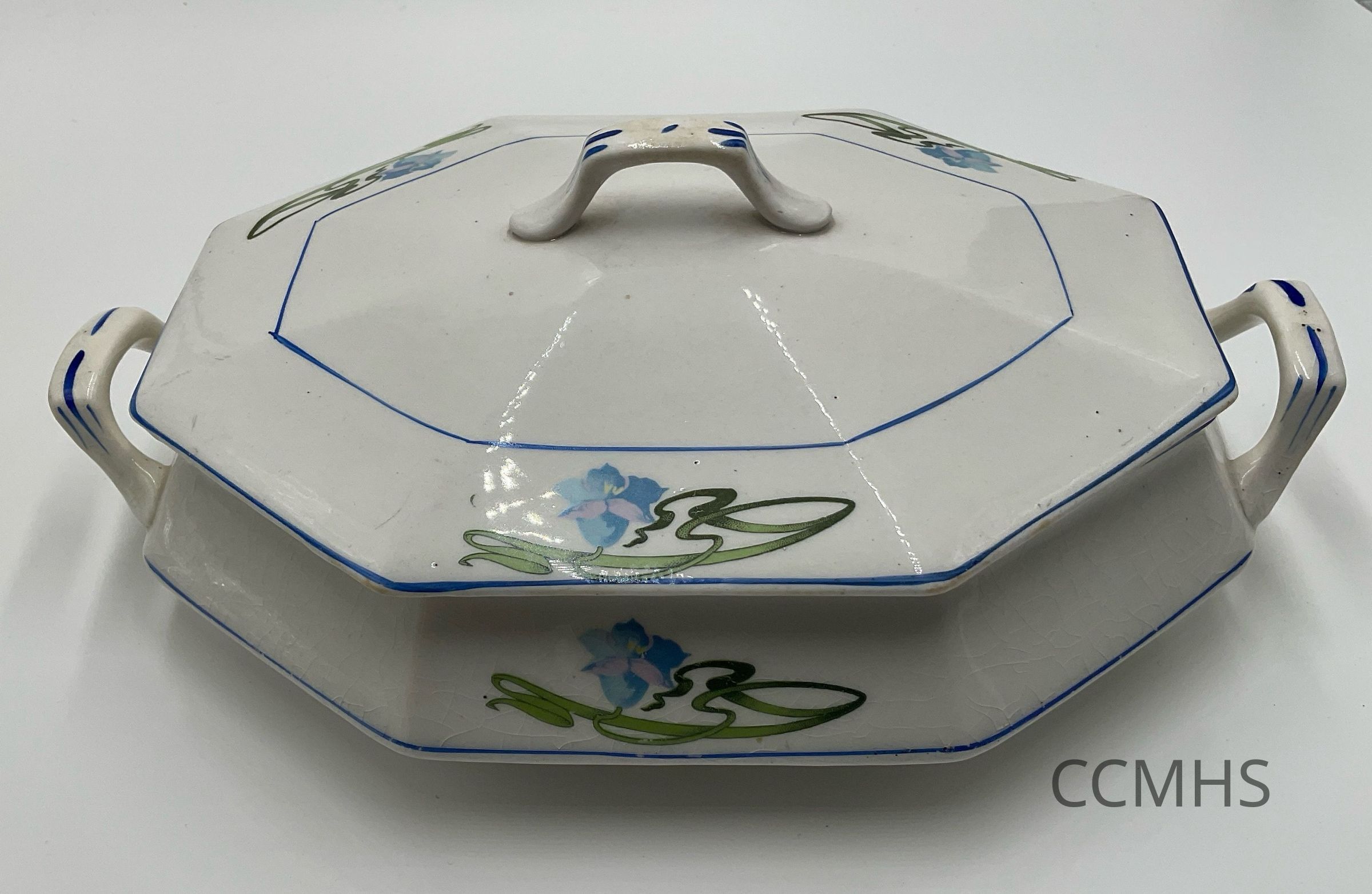 Covered dish, white glaze with blue and green floral designs. Stamped “La Francaise”: likely manufactured by the French China Co. of Sebring, Ohio.Context