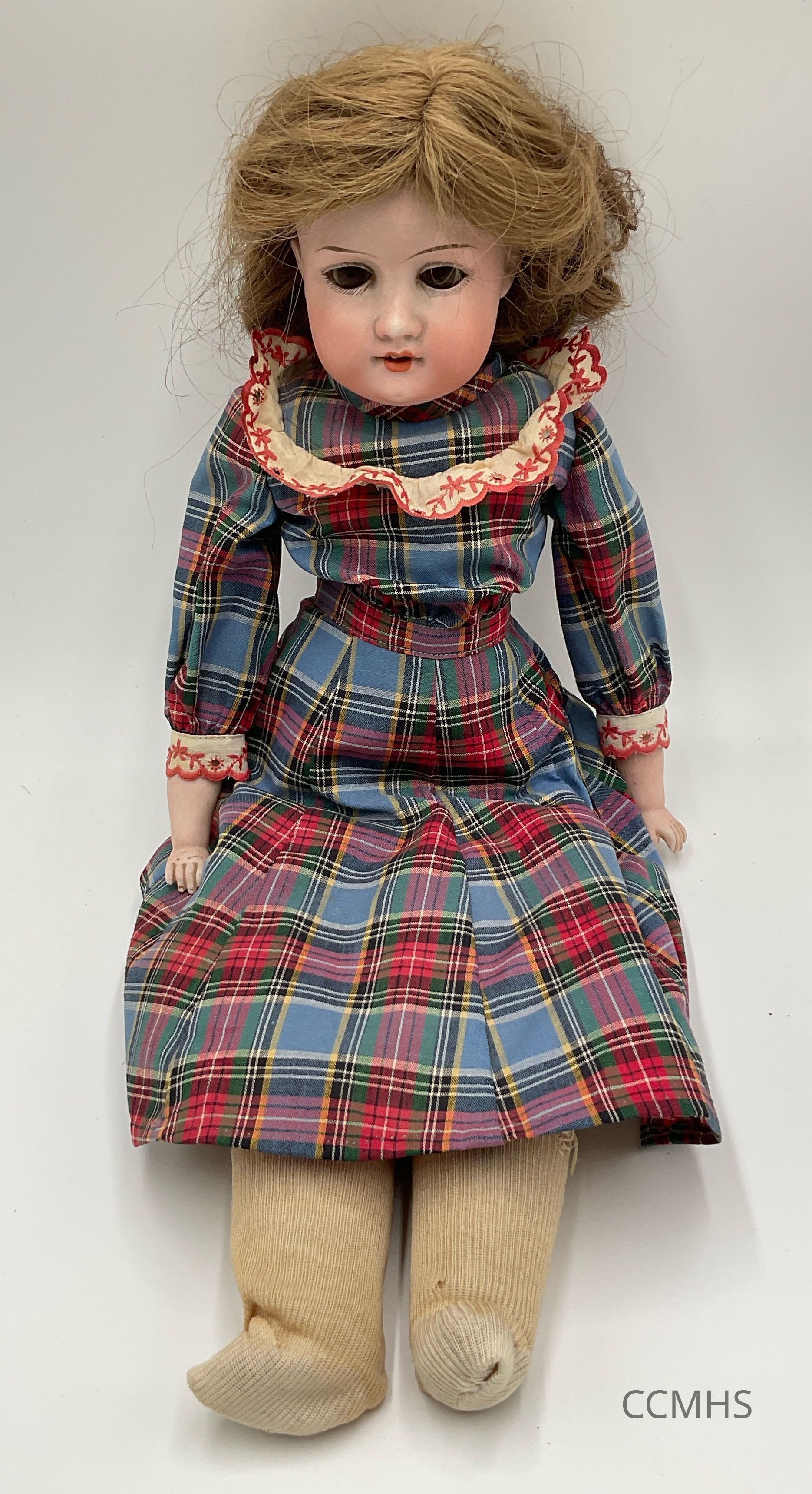 Doll with light brown hair, wearing a blue and red plaid dress.