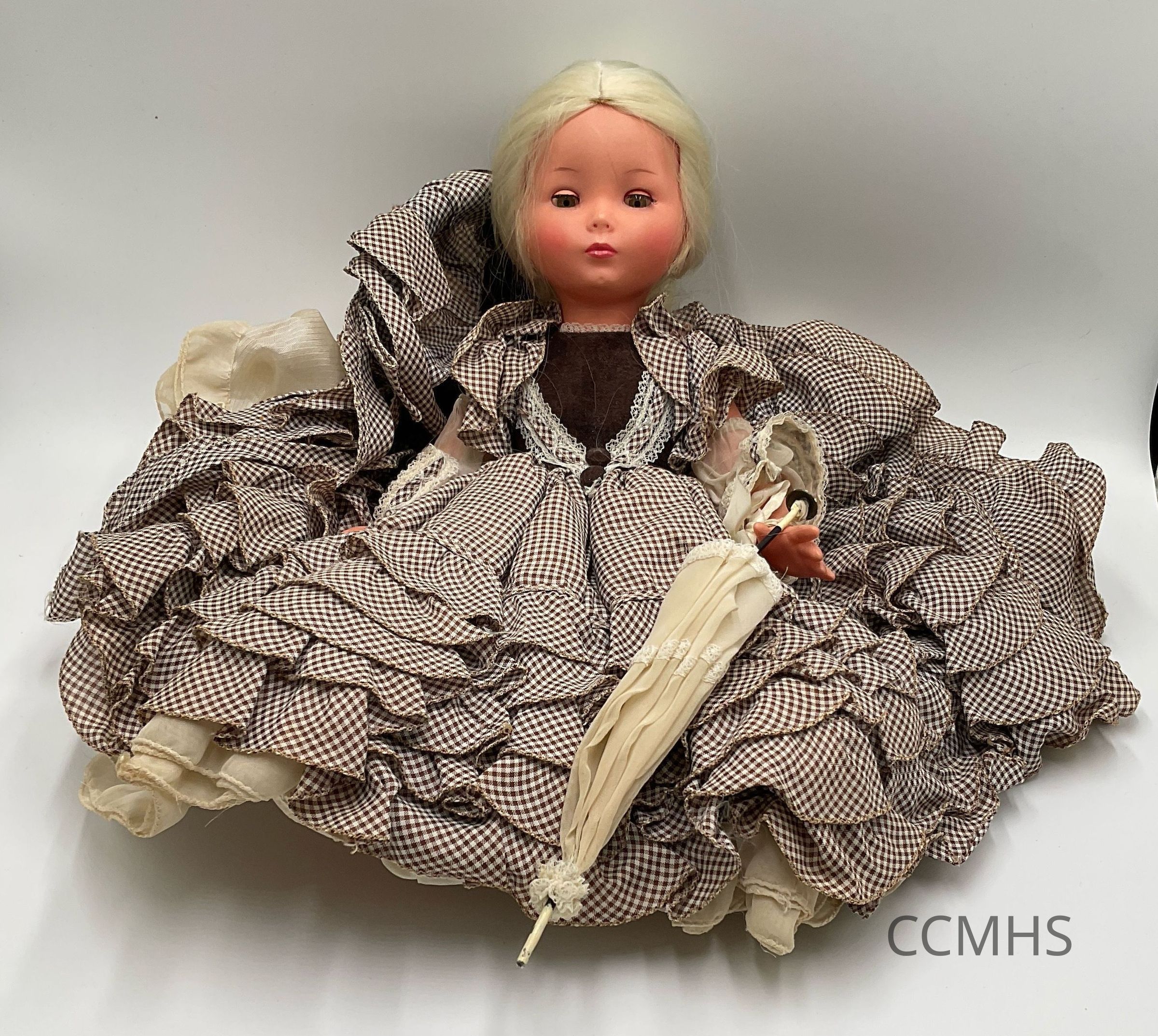 Doll with light blonde hair, wearing a brown and white gingham dress with many layers, holding a cream-colored parasol.
