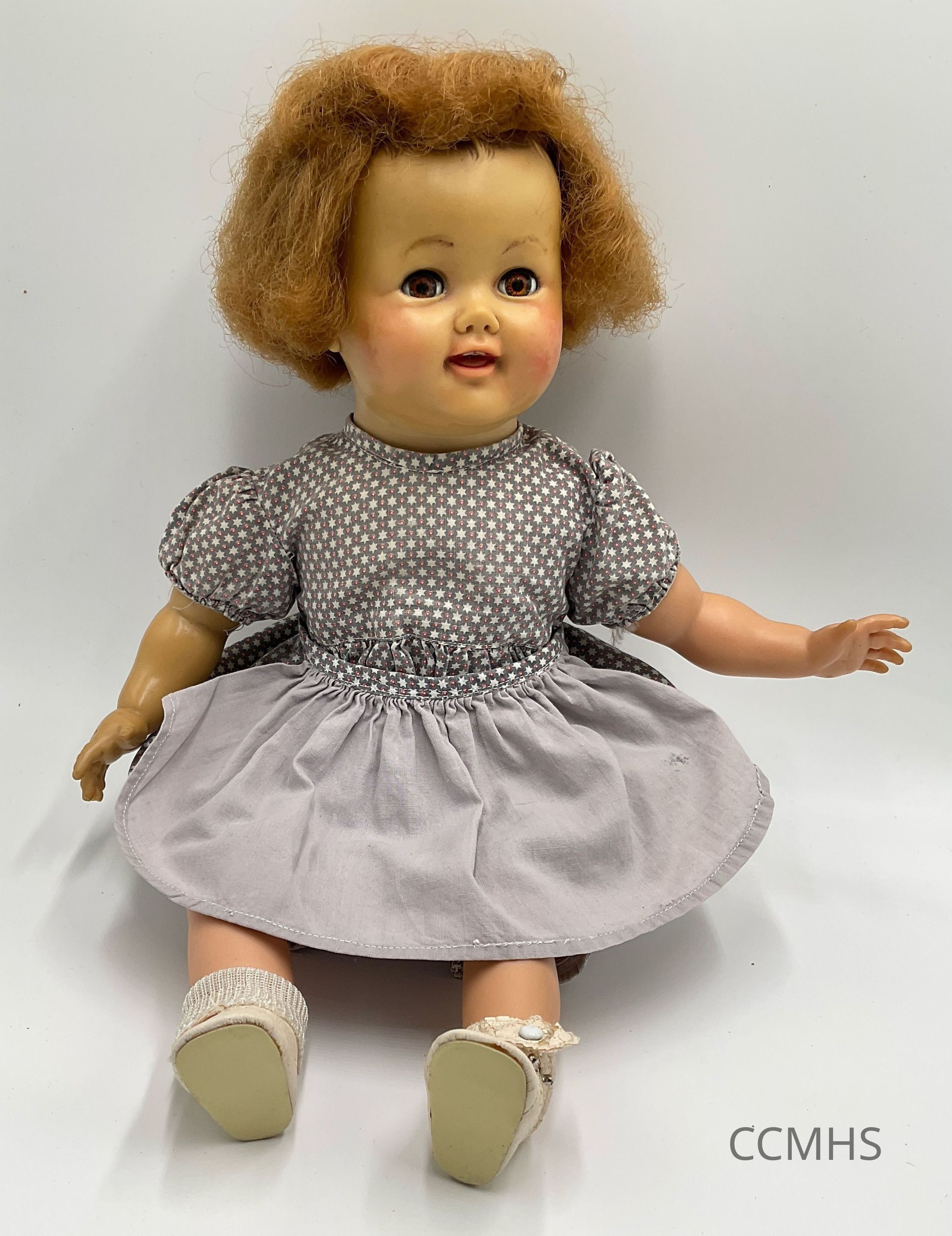 Doll with full, pink cheeks and light brown frizzy hair, wearing a gray dress with white stars on the top.