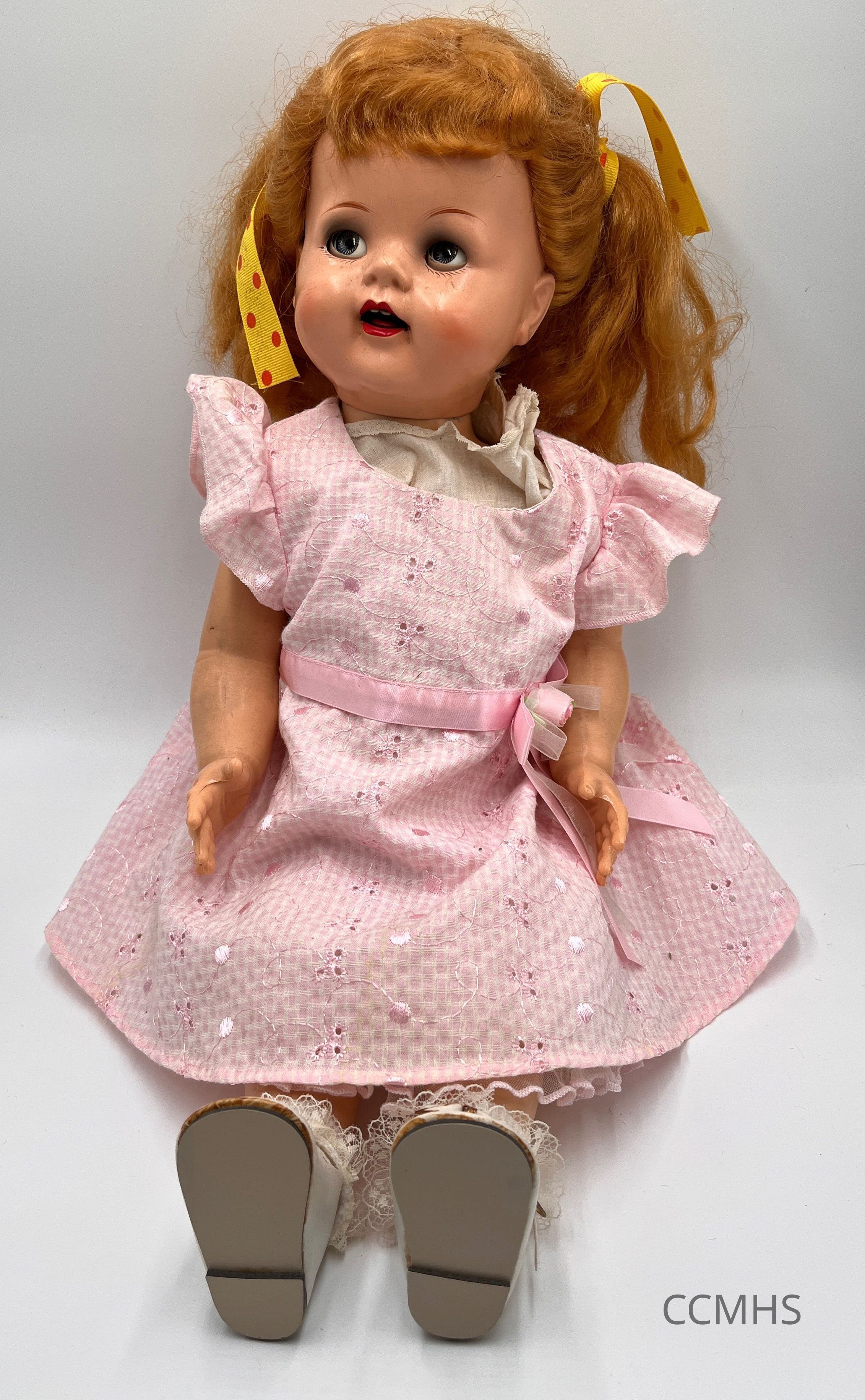 Doll with reddish-brown hair wearing a pink checkered dress and shoes.