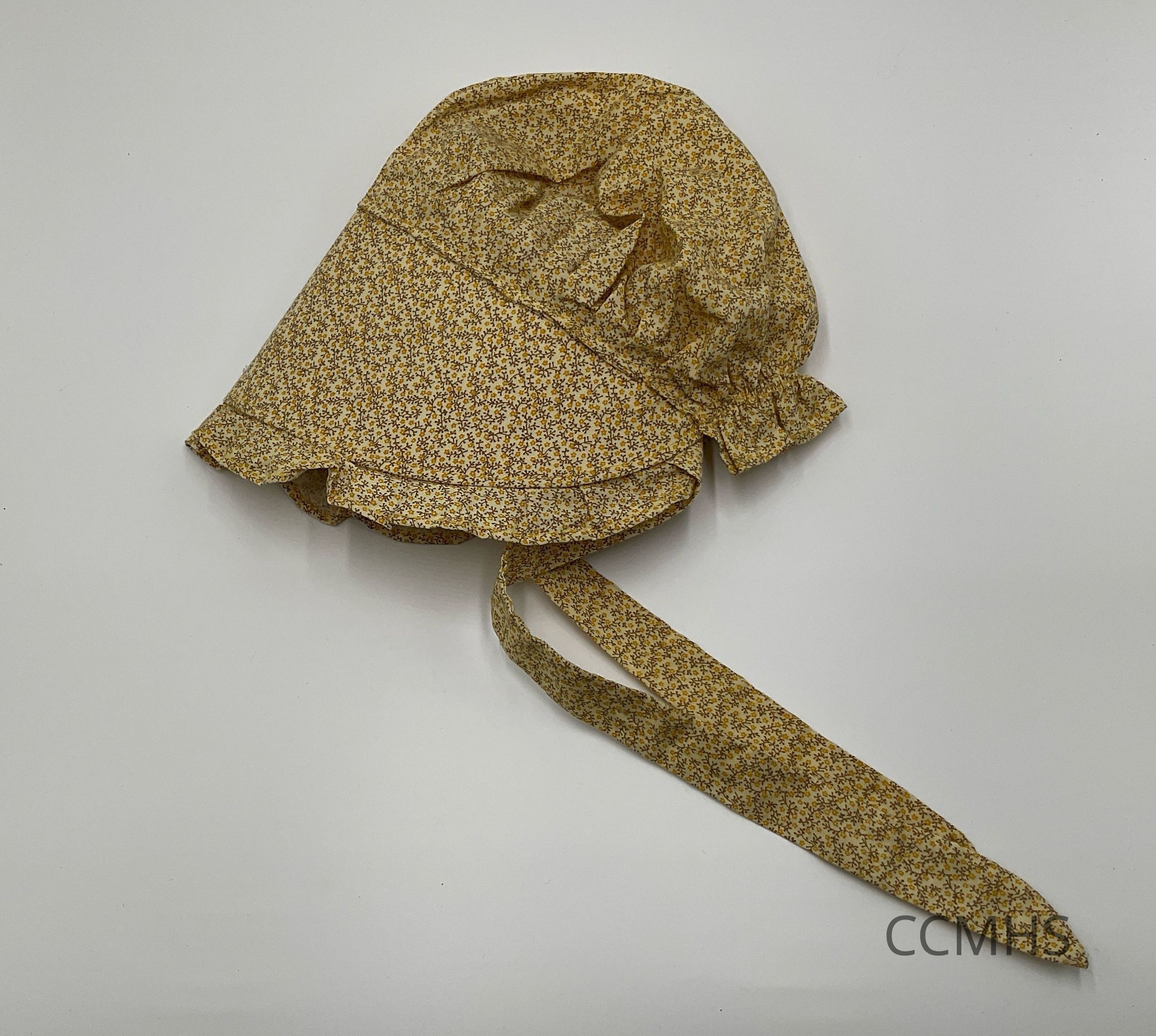 Doll cap with yellow and brown floral design.