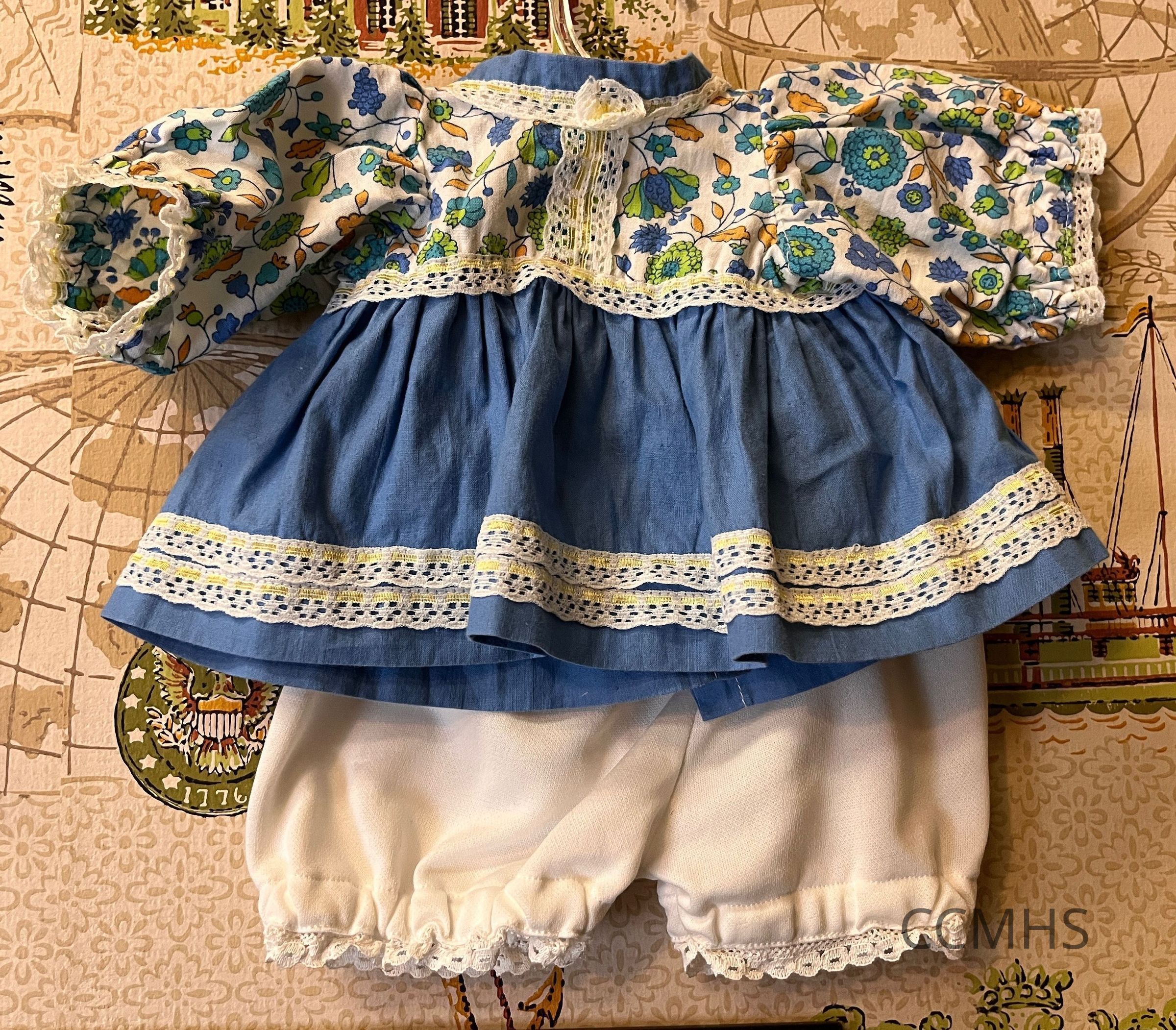 Doll’s outfit including white pants with lace at the bottom, and a dress with a blue floral pattern on the top half and sleeves and a solid blue fabric on the bottom half, decorated with white and yellow ribbon along the bottom of the shirt.Context