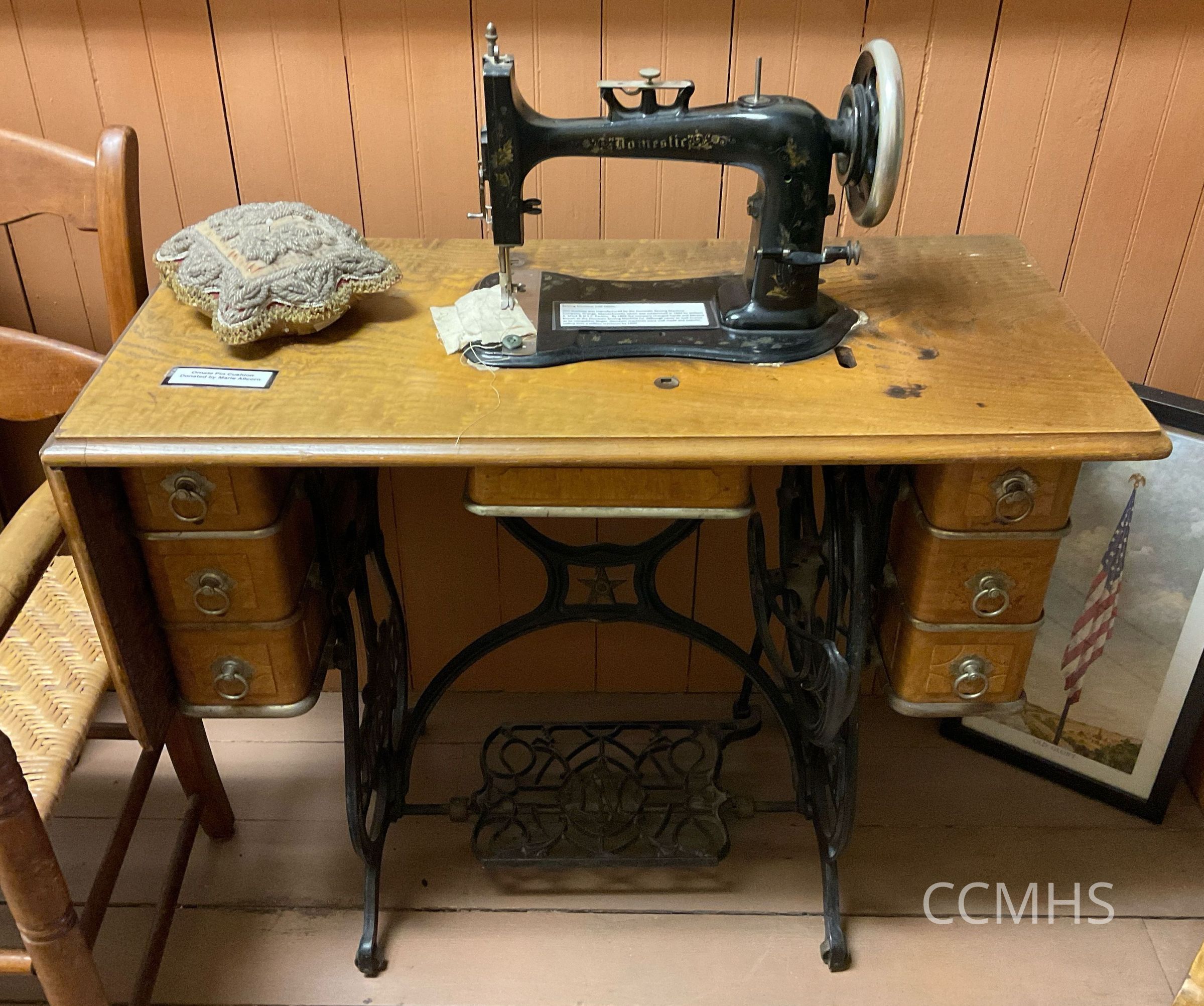 This sewing machine was manufactured by the Domestic Sewing Machine Company, Orange, Massachusetts, which was established in 1864 by William A. Mack & N.S.C. Perkins. Although never as well-known as its competitor Singer, Domestic machines were well made and popular, selling over a million machines by 1890.