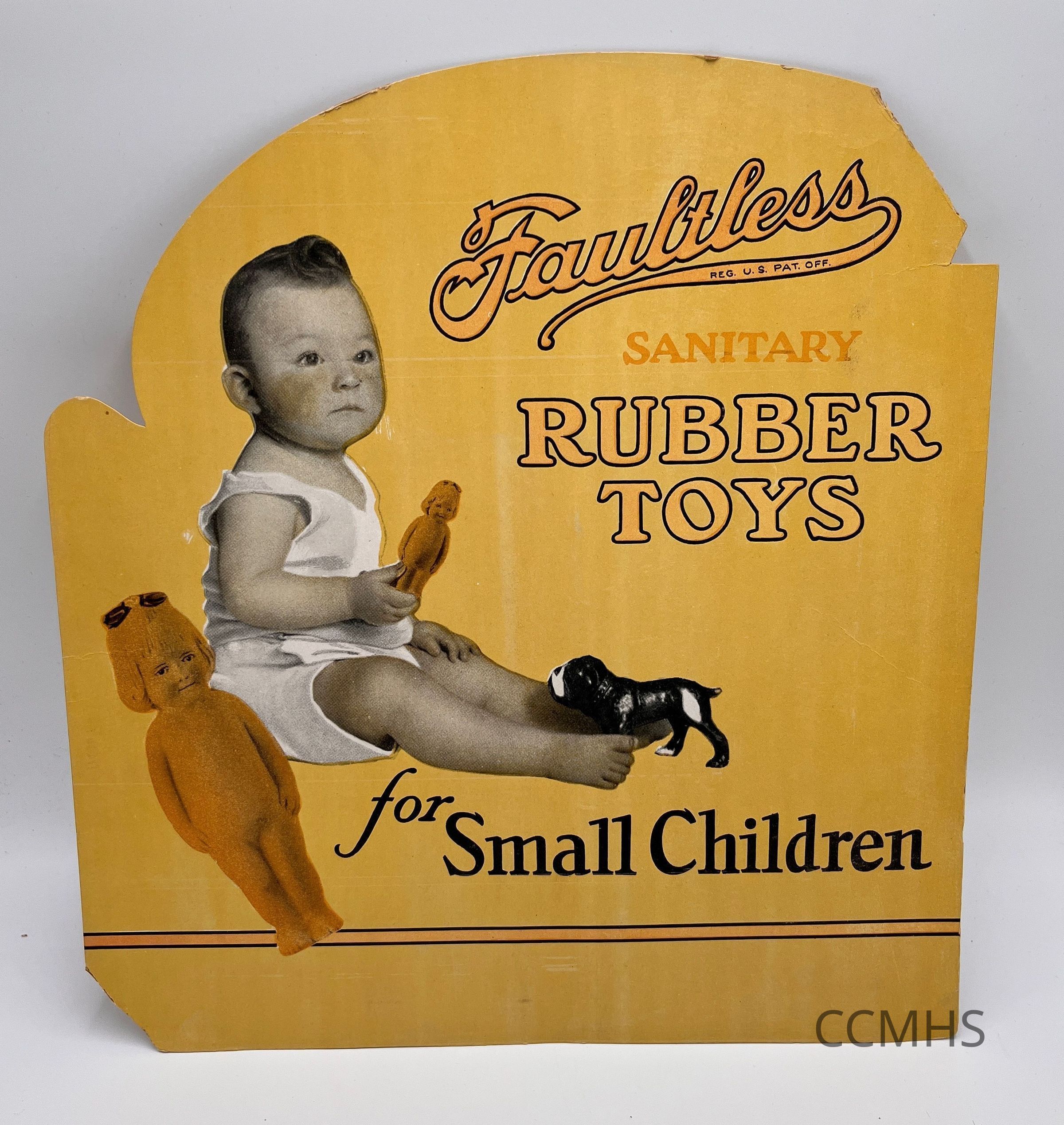 Yellow cardboard sign advertising Faultless Sanitary Rubber Toys for Small Children. Includes a photograph of a seated baby surrounded by rubber toys.