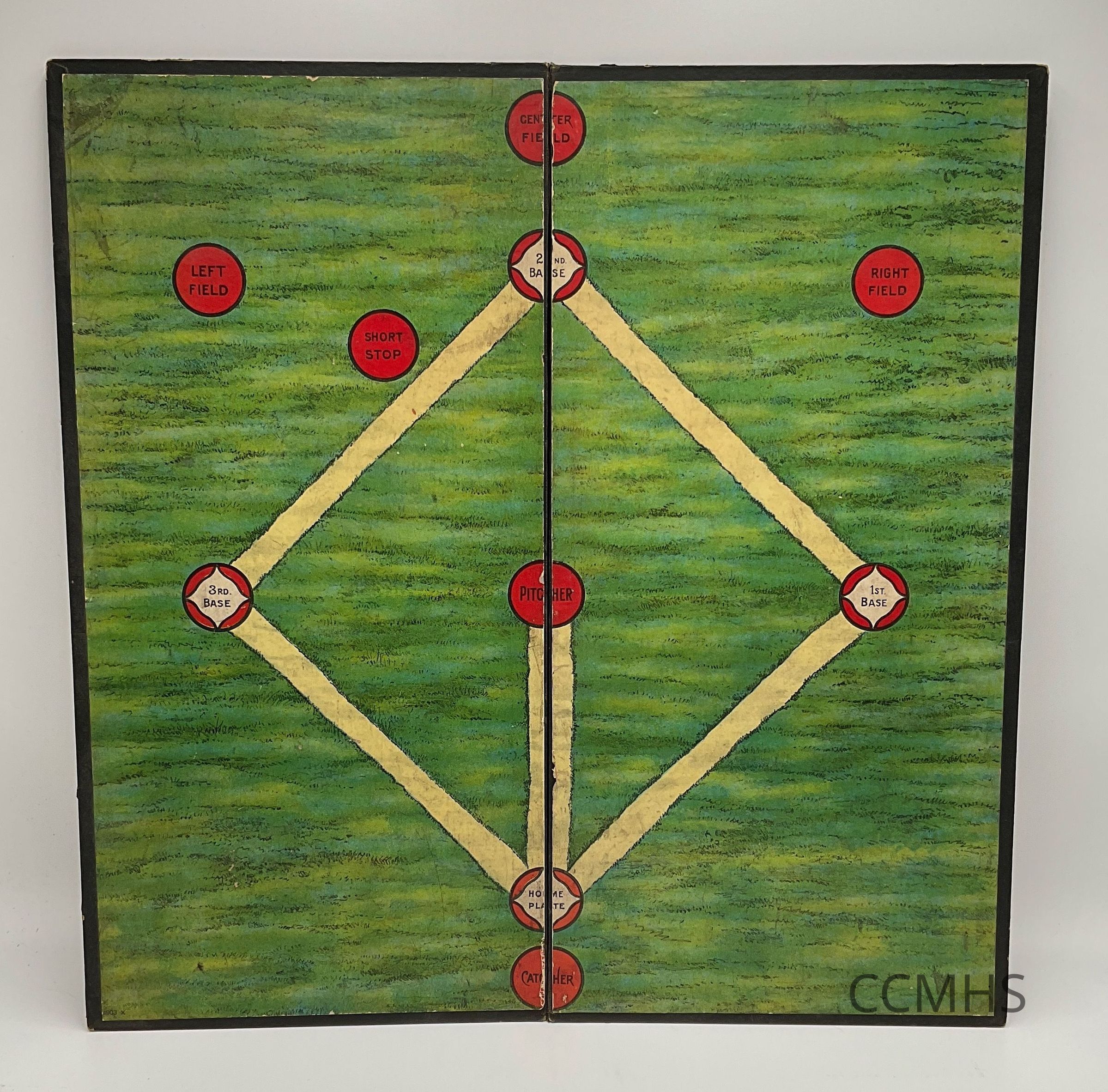 Folding game board with a baseball game on one side and a checkerboard on the other.
