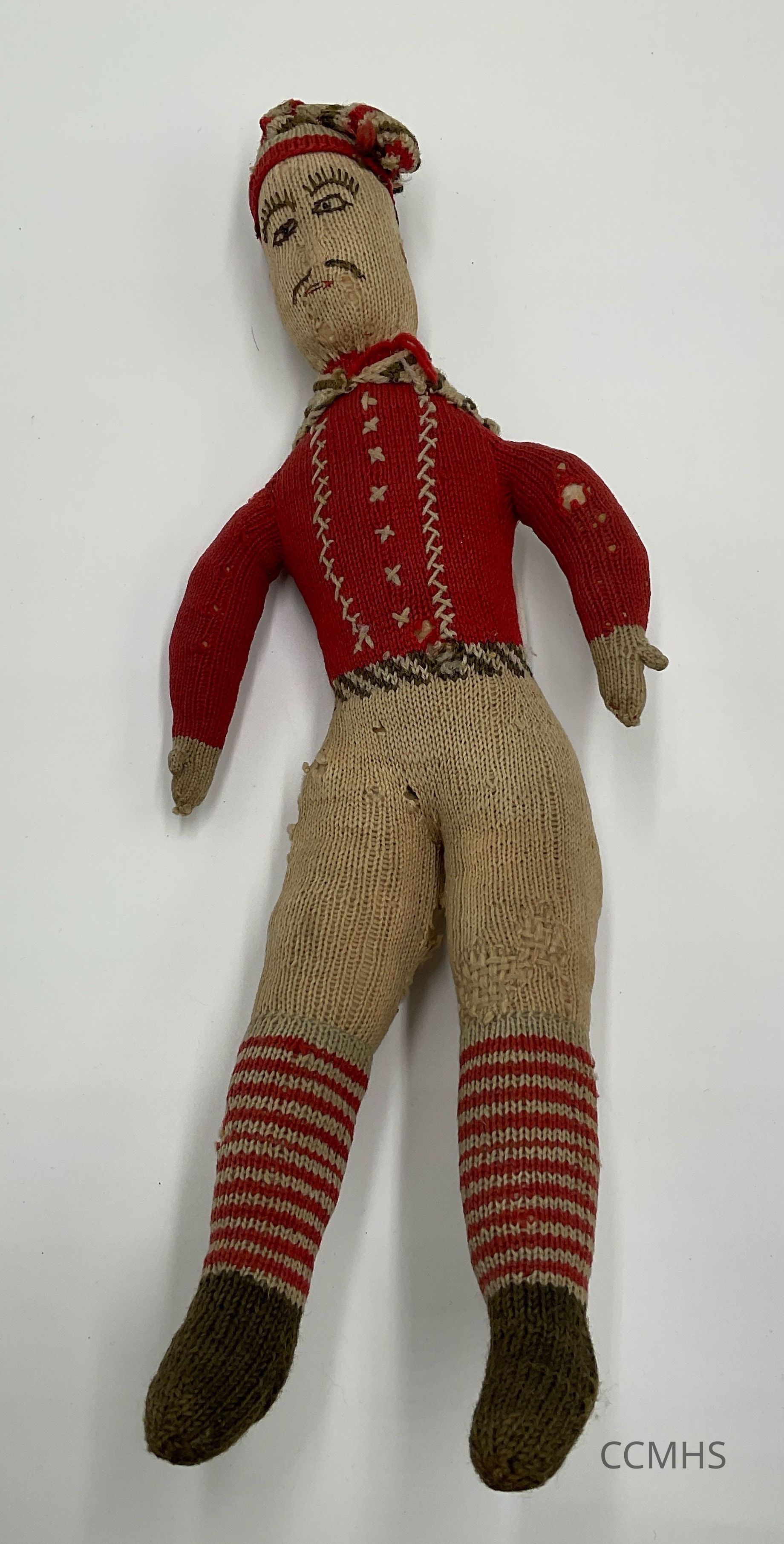Handmade, knitted doll. Red shirt, cream pants, red and cream striped socks.