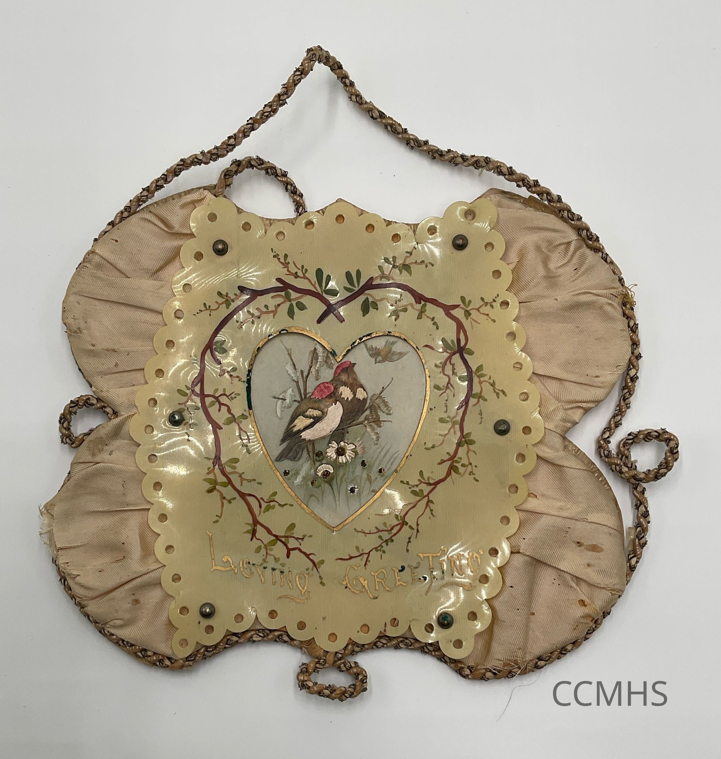 Decorative piece with a cardboard support, covered in fabric, with a plastic, punched element hand painted with branches and the words “Loving Greetings.” At the center, an embroidered image of two birds.