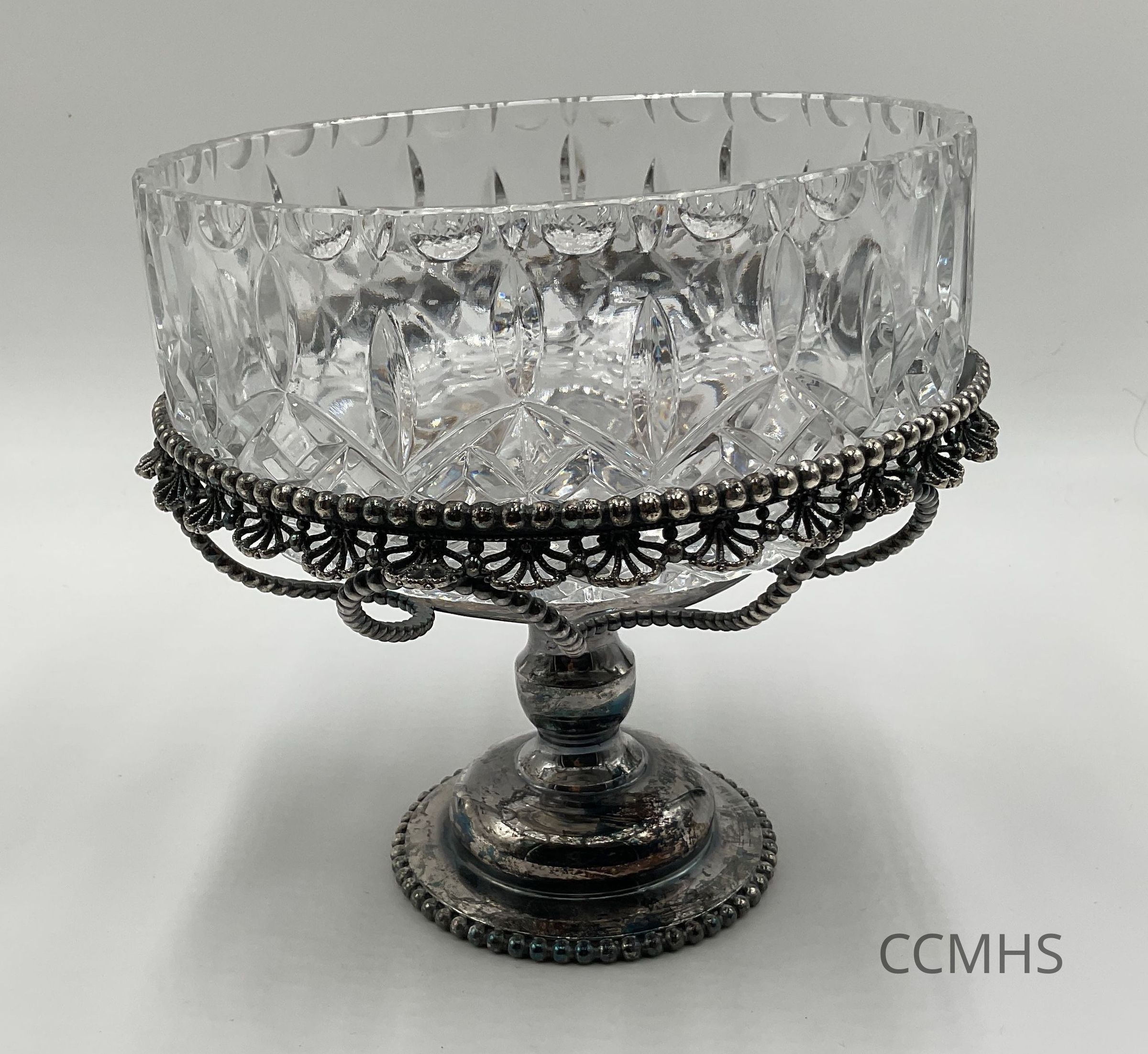 Pewter colored metal stand for a glass bowl. Two symbols etched in base, possibly "05." A break in rim, at original seam, doesn't seem to weaken the holder.