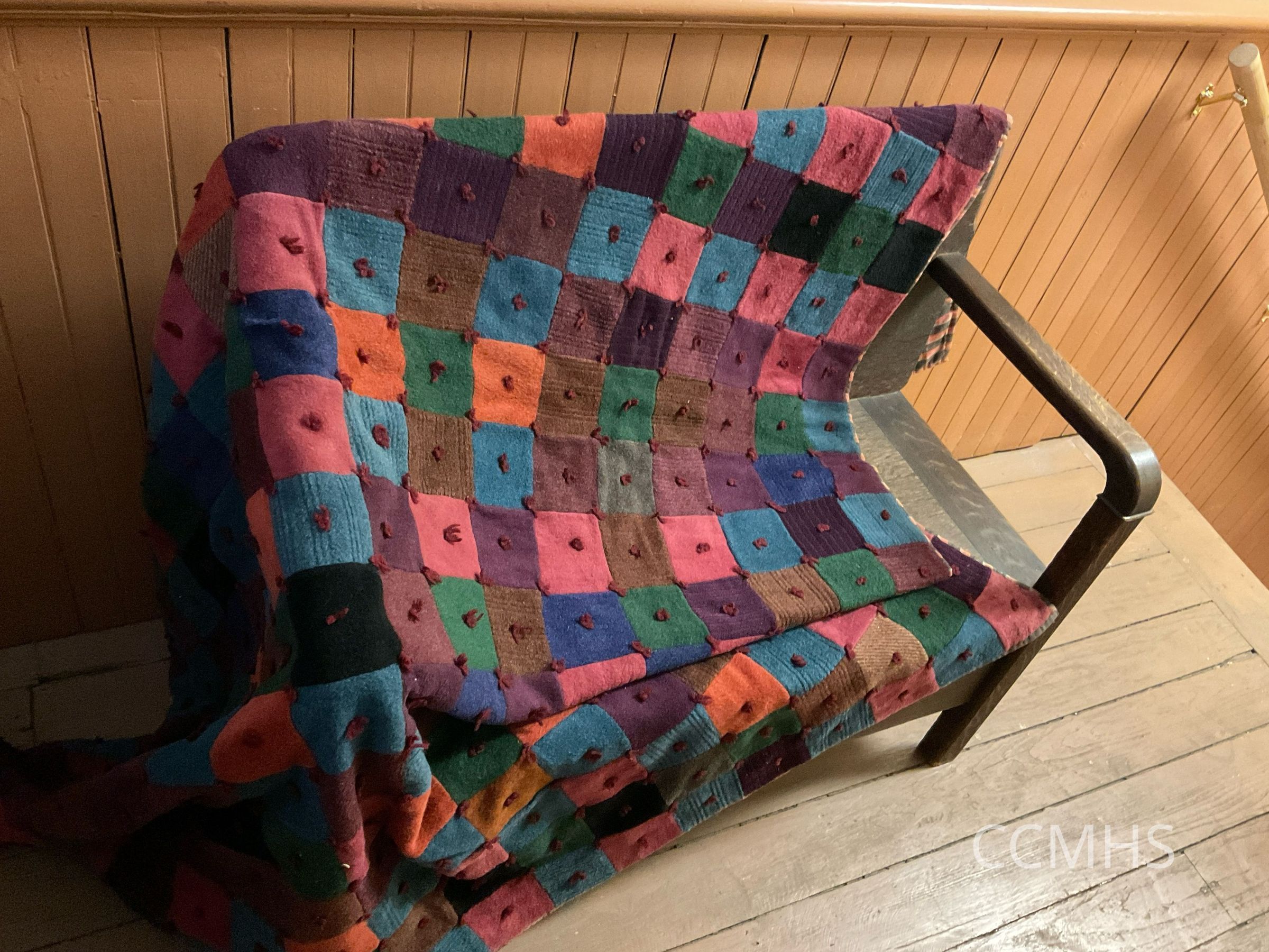 Block patterned, multicolored quilt, with knotted yarn in the middle of each block.Context