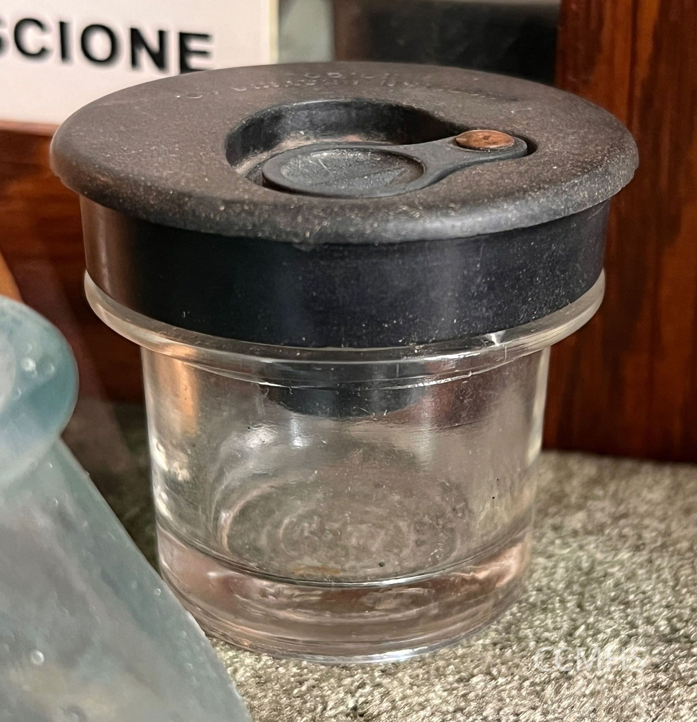 Glass bottle with rubber insert.