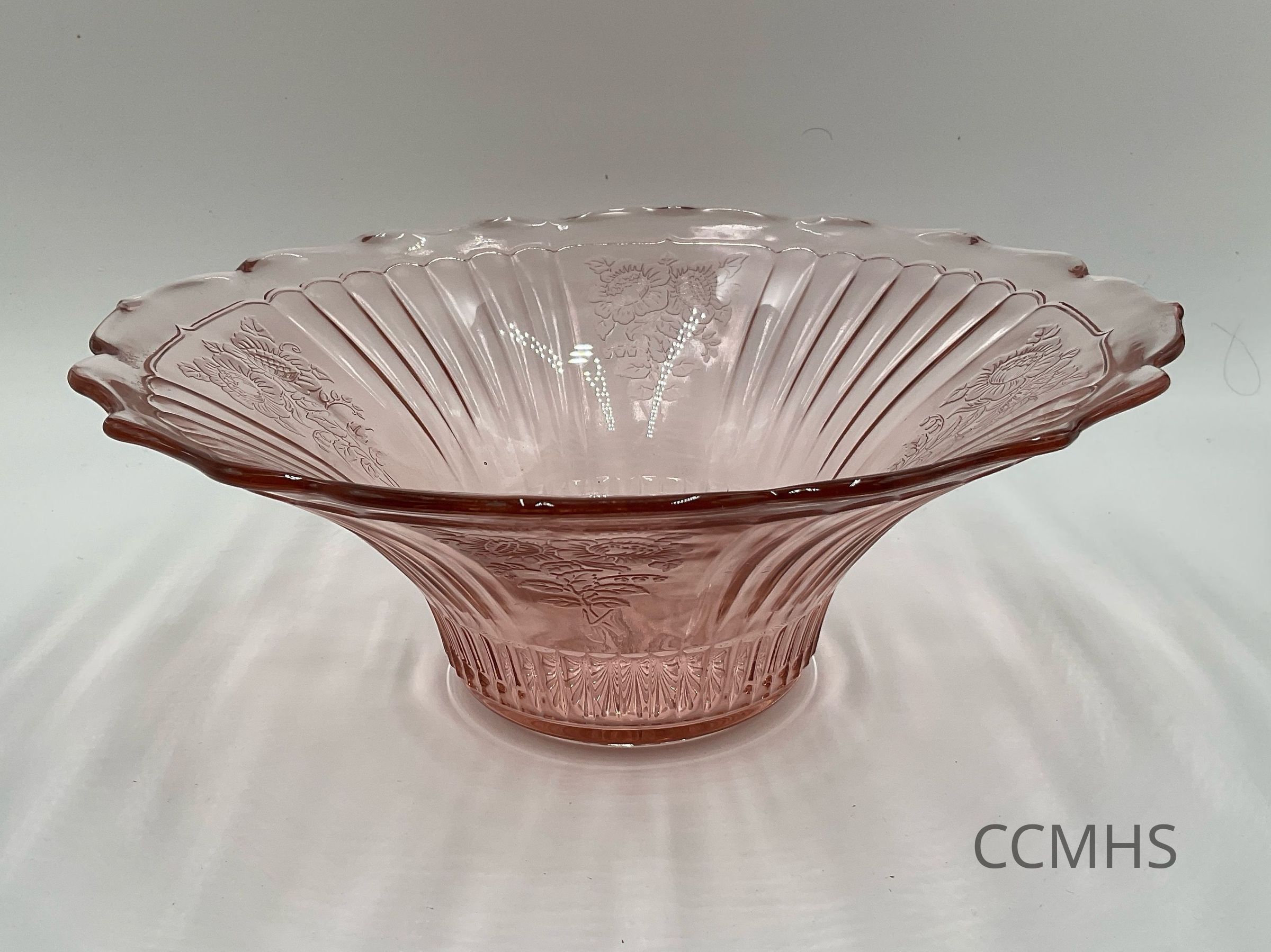 Pink “Mayfair” depression glass bowl with double-headed flower design. Manufactured by Anchor Hocking.Context