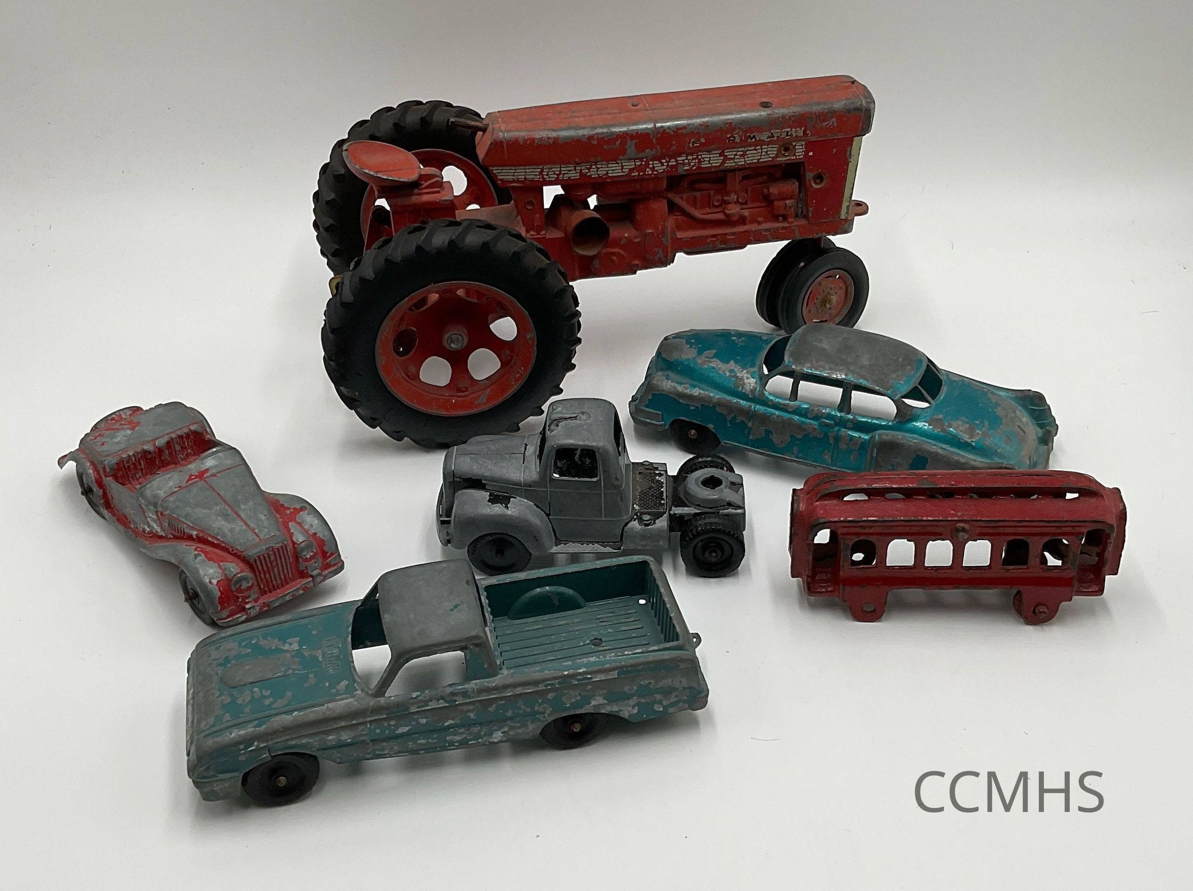 Group of diecast metal toy vehicles: a tractor, two cars, two trucks and a trolley.