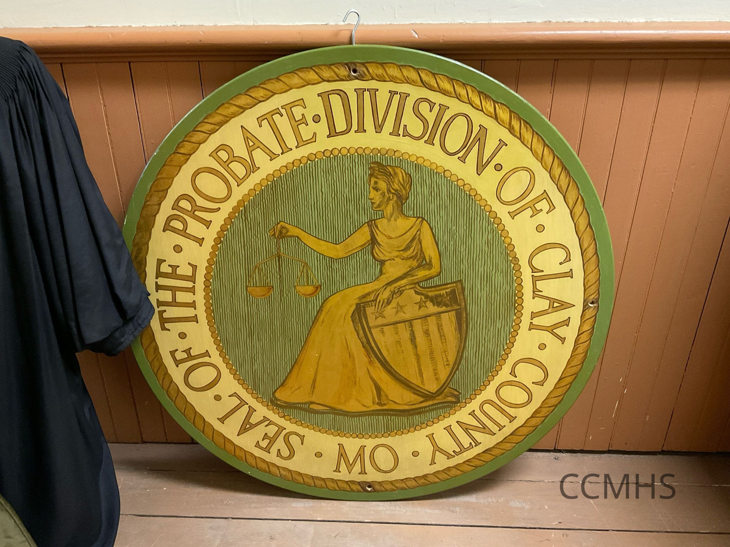 Round wood sign, painted with the seal of the probate division of Clay County, Missouri.
