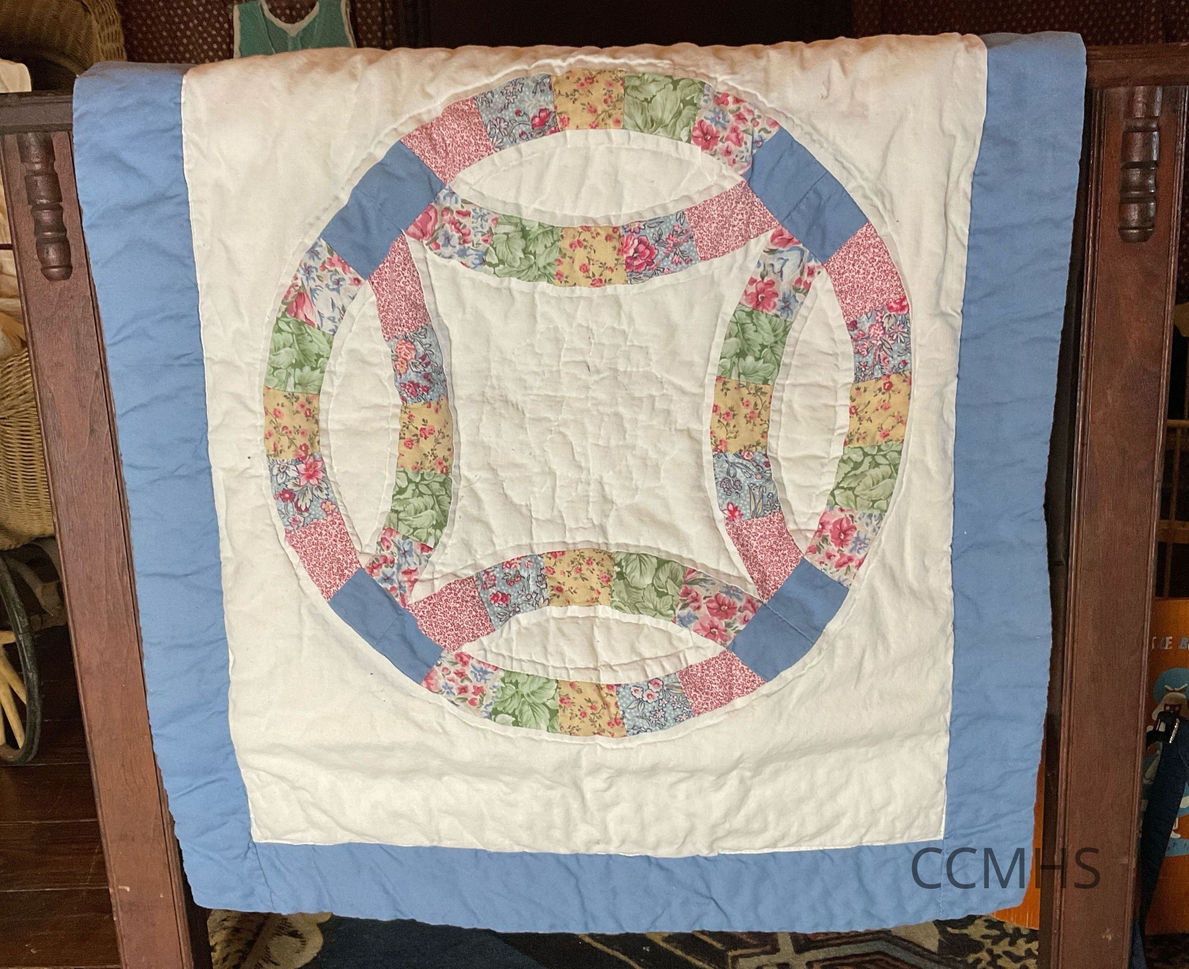 Small quilt with a blue border and a circular pattern made of floral fabrics in the center.