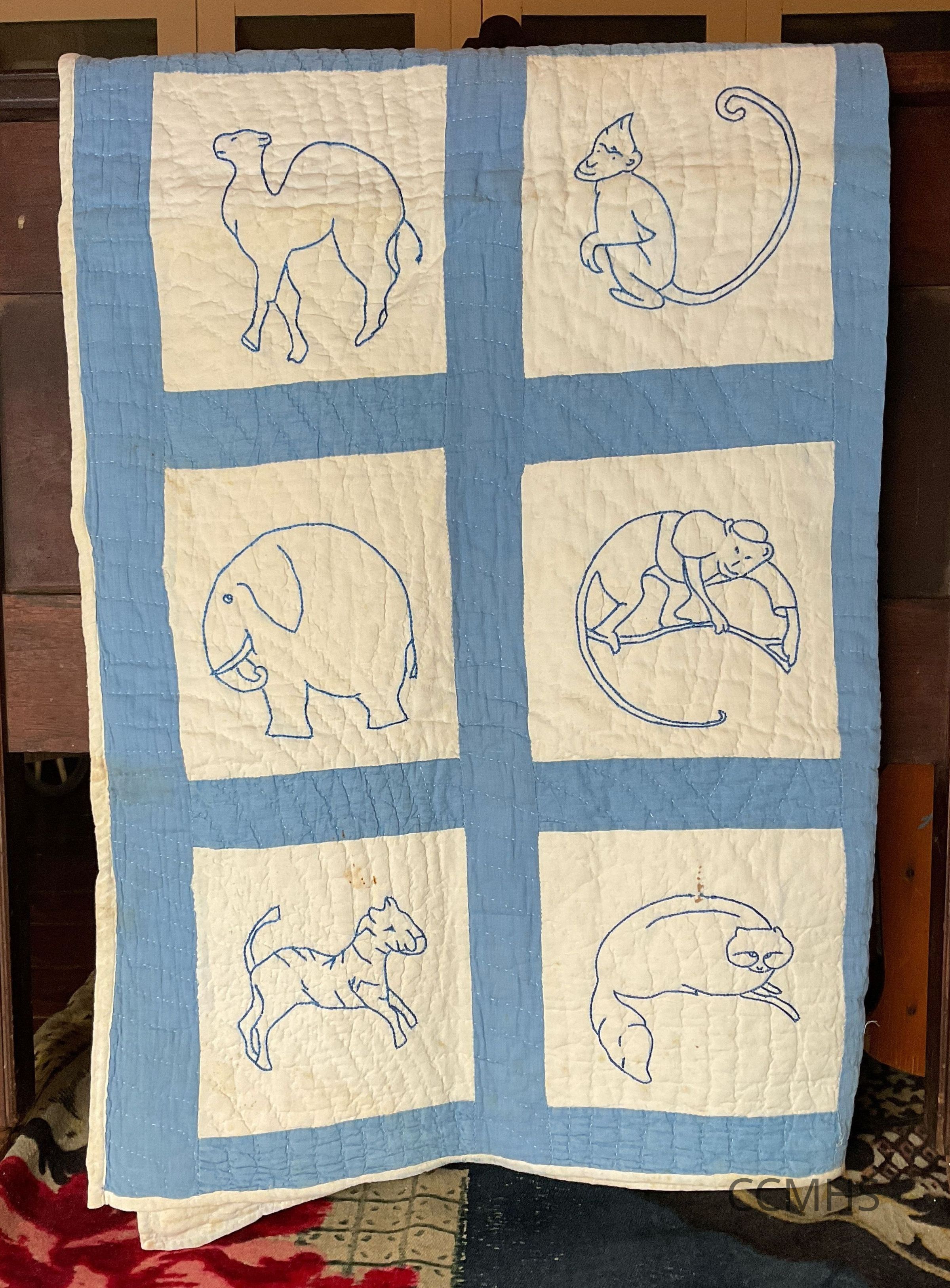 Quilt with white squares, within which are stitched outlines of animals in blue thread, surrounded by blue borders.