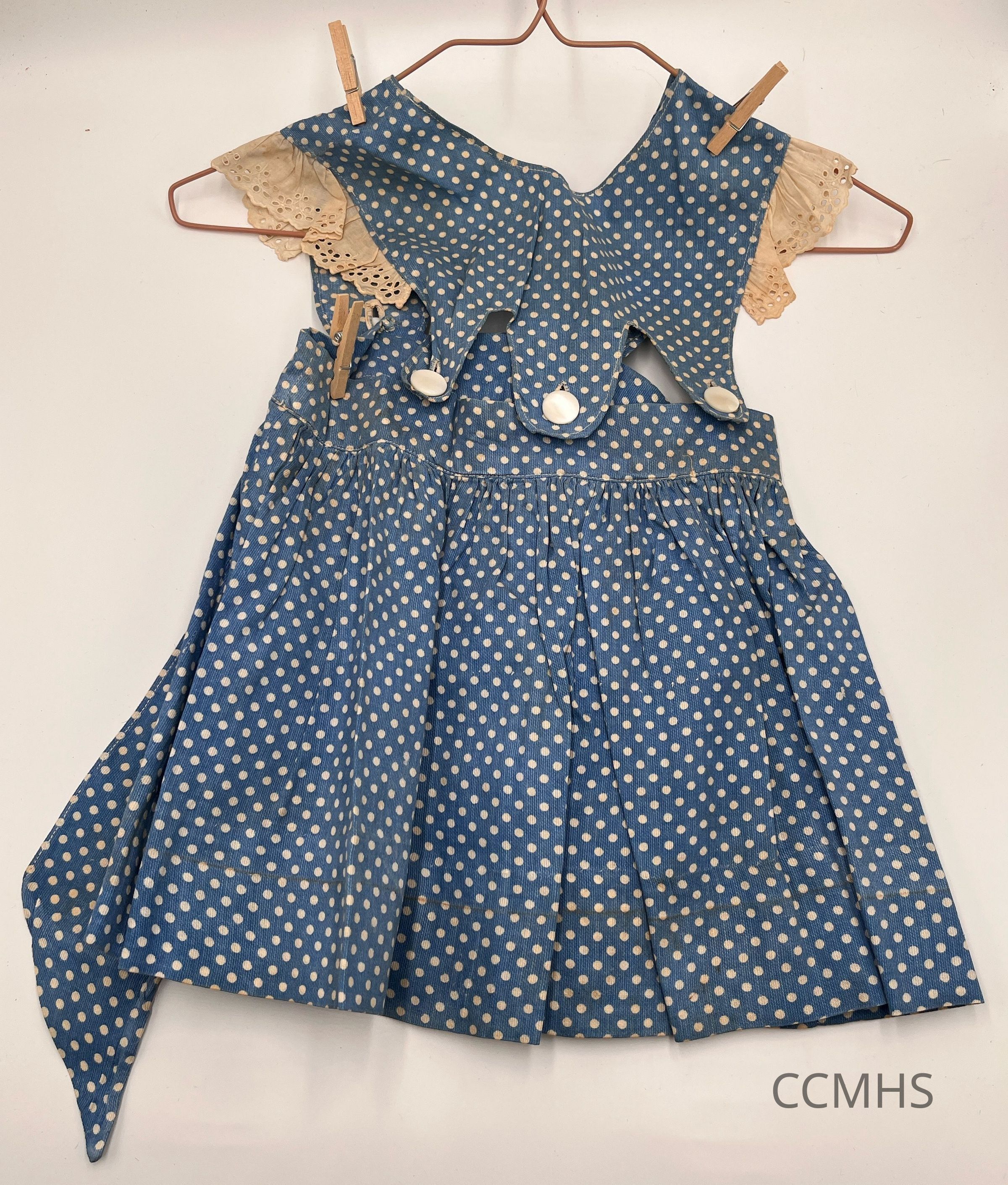 Blue toddler’s dress with white polka dots pattern and white lace ruffles on the sleeves.