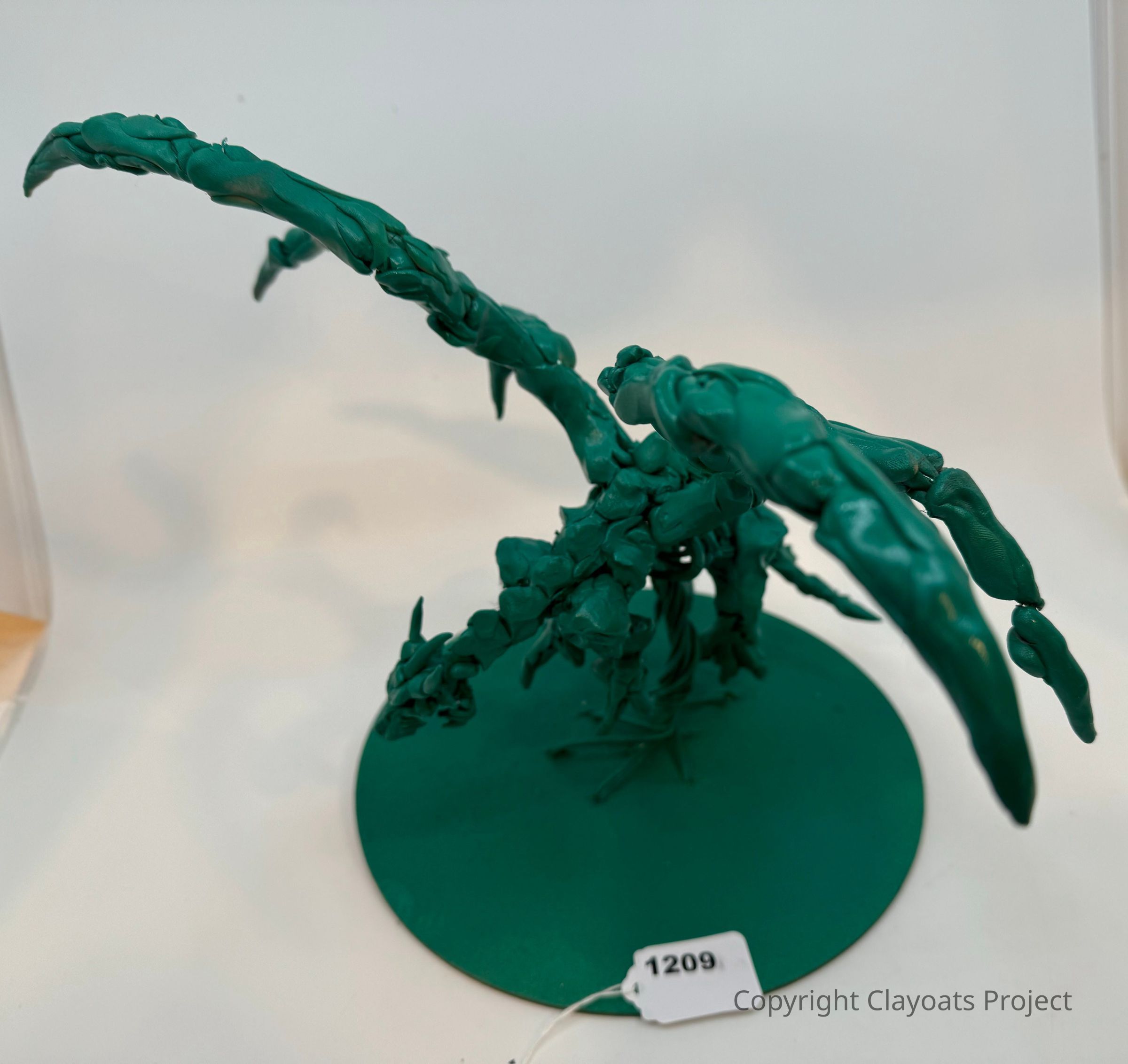 The image showcases a green, handcrafted sculpture made from a moldable material, resembling a mythical creature with multiple limbs and an extended, wing-like structure, all perched on a circular base; while the background is a simple white, emphasizing the intricate texture and details of the sculpture, such as its intertwining limbs and dynamic posture, which together suggest movement or flight, capturing a sense