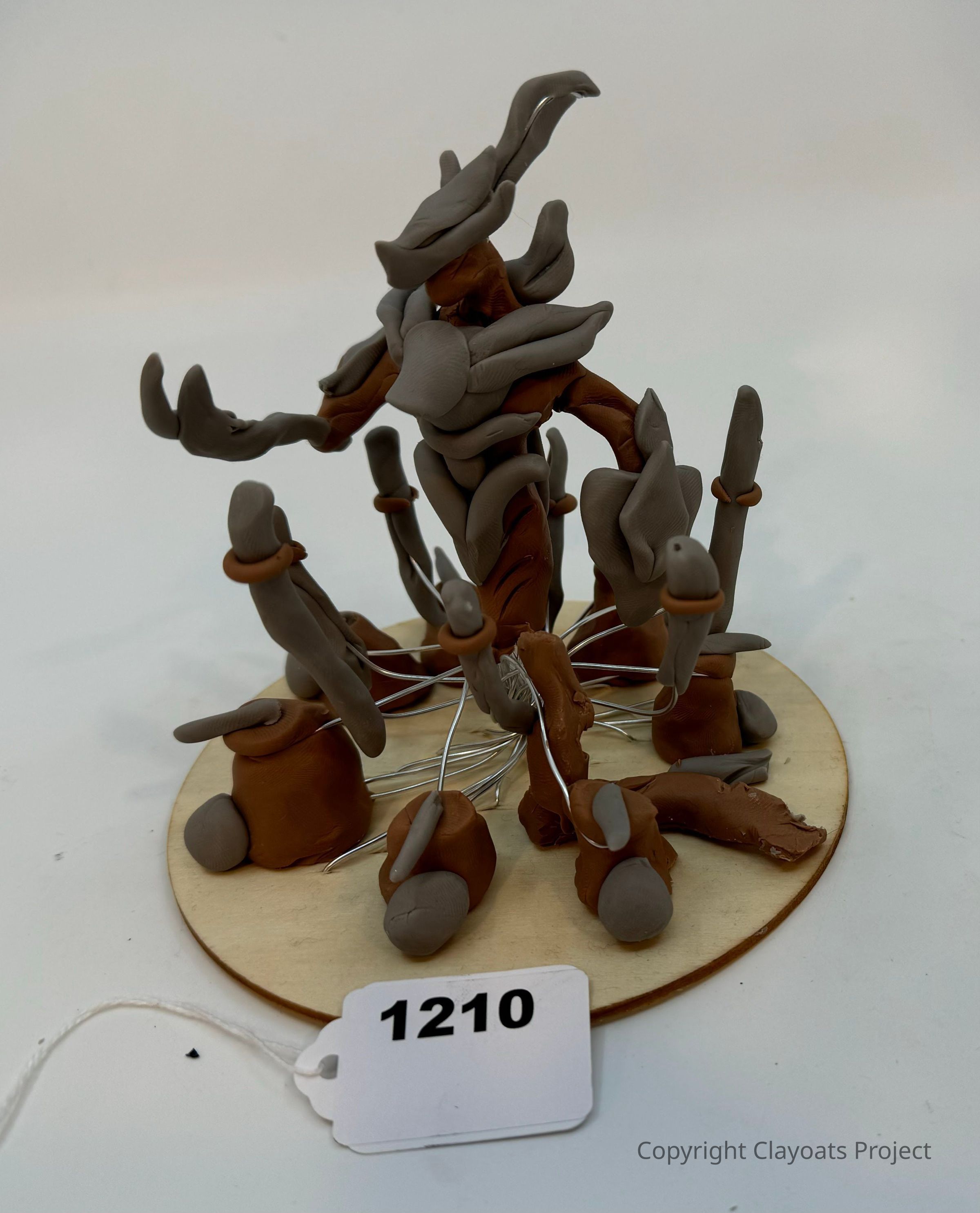The image shows a unique sculpture composed of gray and brown clay pieces, intricately assembled on a round wooden base. It seems to depict an abstract figure with extended limbs and what could be interpreted as a head, all connected by fine wire elements. The sculpture appears dynamic, as if in motion, with various clay components creating a textured and multi-layered appearance that invites curiosity and interpretation.