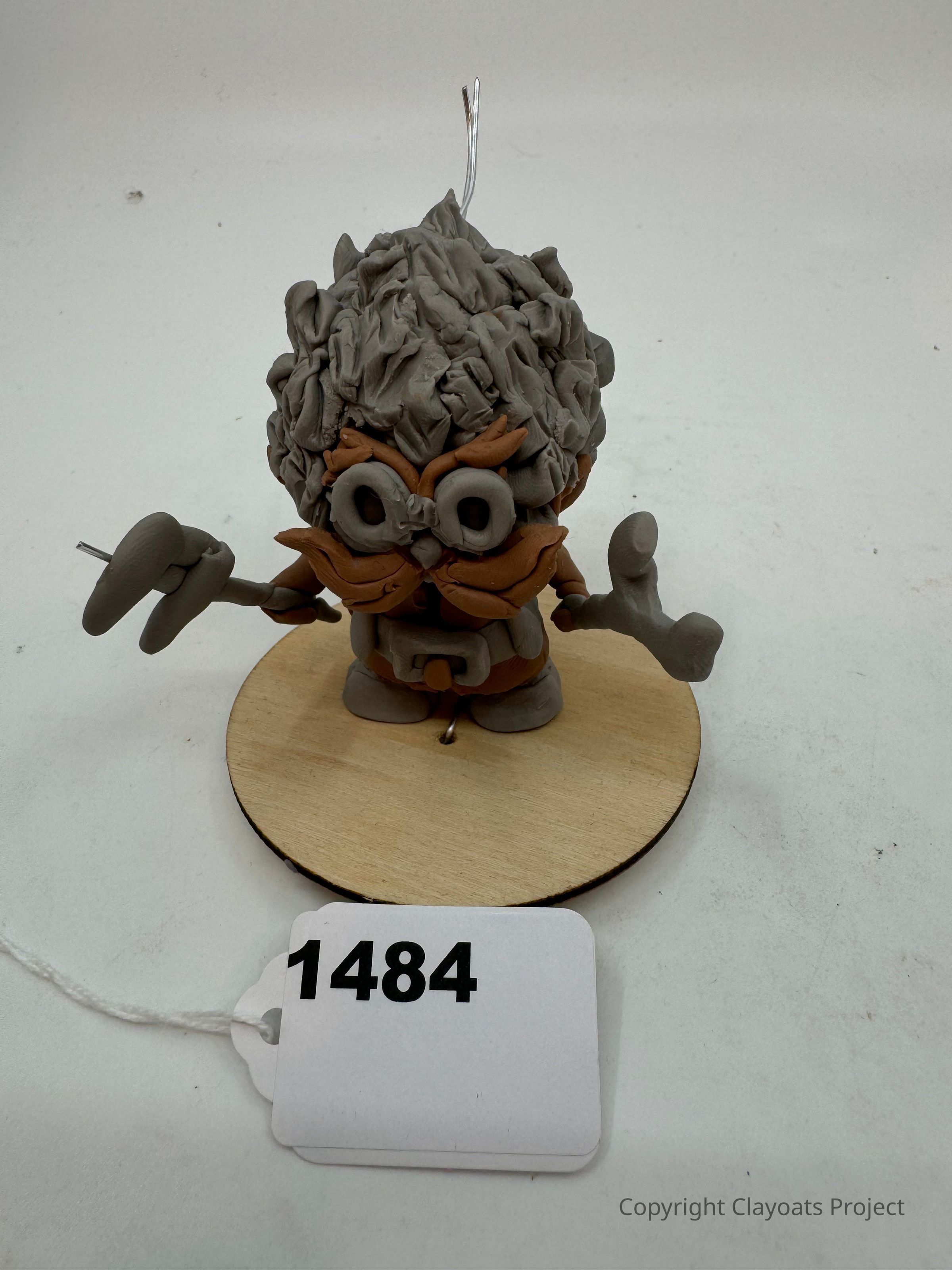 The image depicts a small, whimsical clay figure featuring exaggerated features such as large eyes and a bushy, textured head, reminiscent of hair or fur. It is meticulously crafted and placed on a circular wooden base. The figure strikes a playful pose, with one arm extended outward and the other bent at the elbow, as if gesturing joyfully.