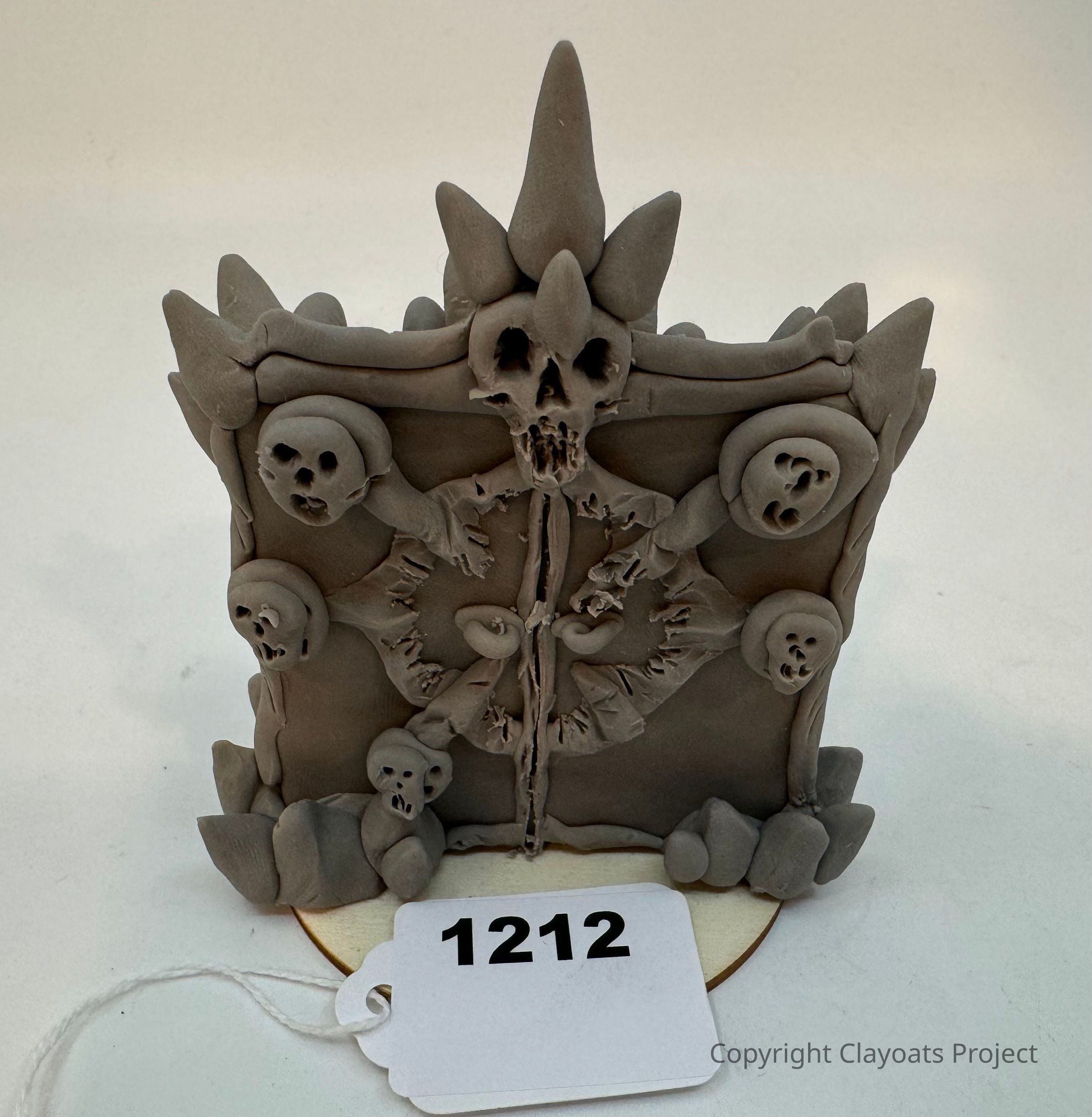 The image shows a sculpture made from a gray material, featuring an intricate design with multiple skulls embedded into a rectangular structure. The centerpiece of the sculpture is dominated by a prominent, larger skull with pronounced features and an array of spikes jutting out along the top edge. Smaller skulls are arranged in a circular pattern around the main skull, all of them detailed with hollow eyes and mouths, creating an eerie and macabre appearance. The entire piece sits atop a simple circular base.