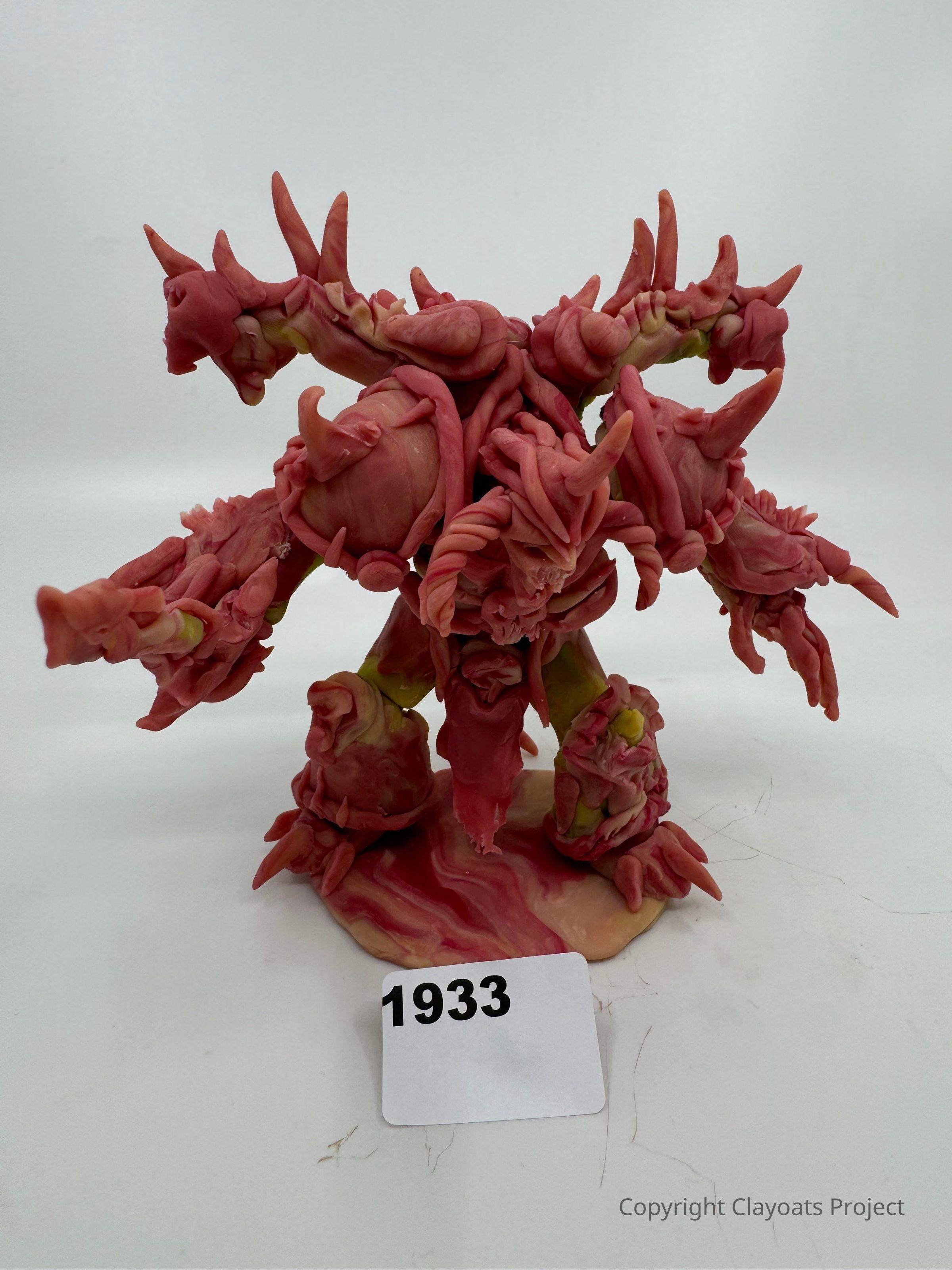 The image shows a clay sculpture of a fantastical creature with multiple limbs and spiky protrusions, made from reddish and pinkish clay, standing on a smooth base.