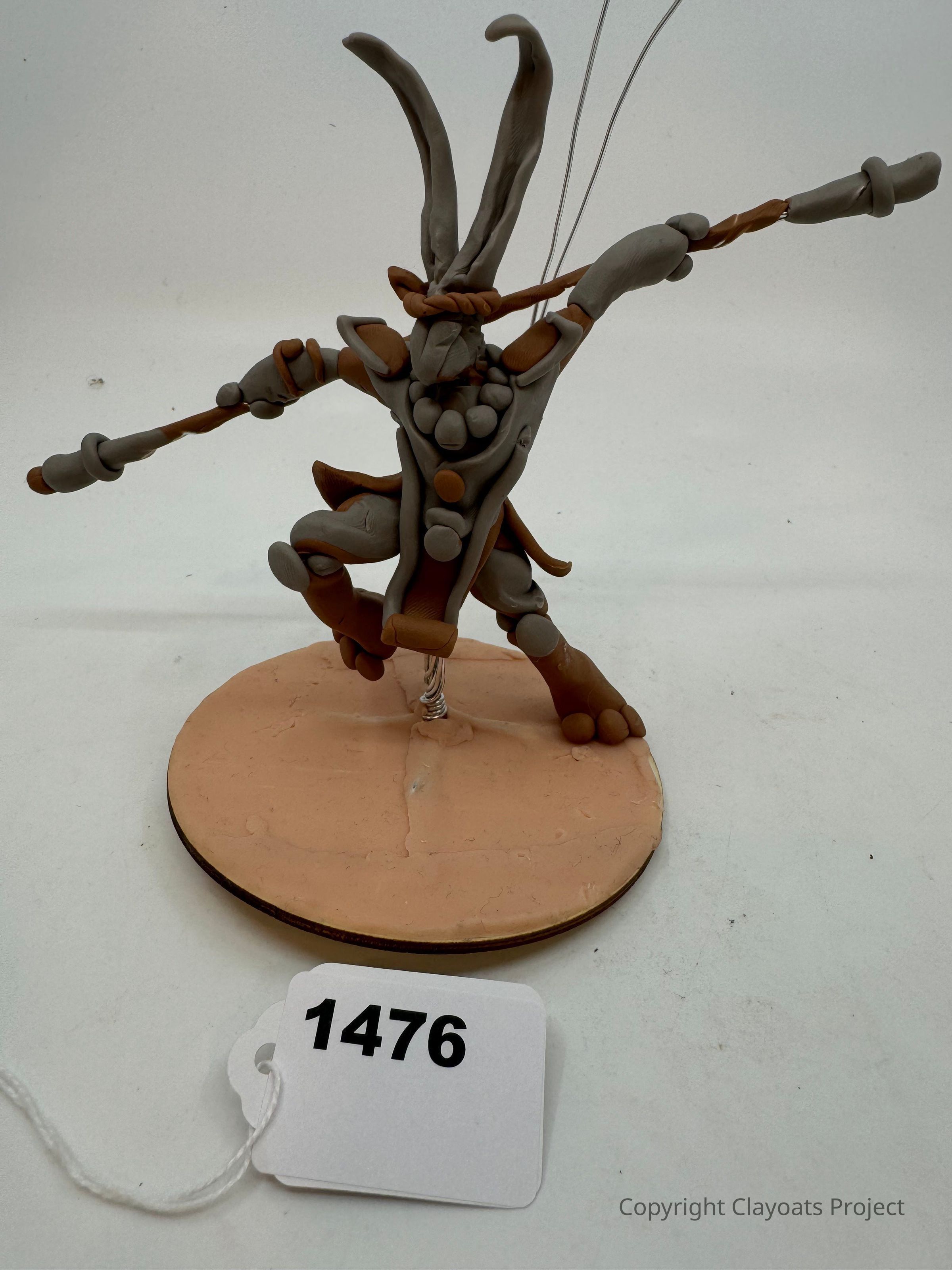The image depicts a clay sculpture of a character with rabbit-like ears and a warrior pose, standing on a circular base; it's crafted with various shades of clay and has a dynamic stance, holding a staff.