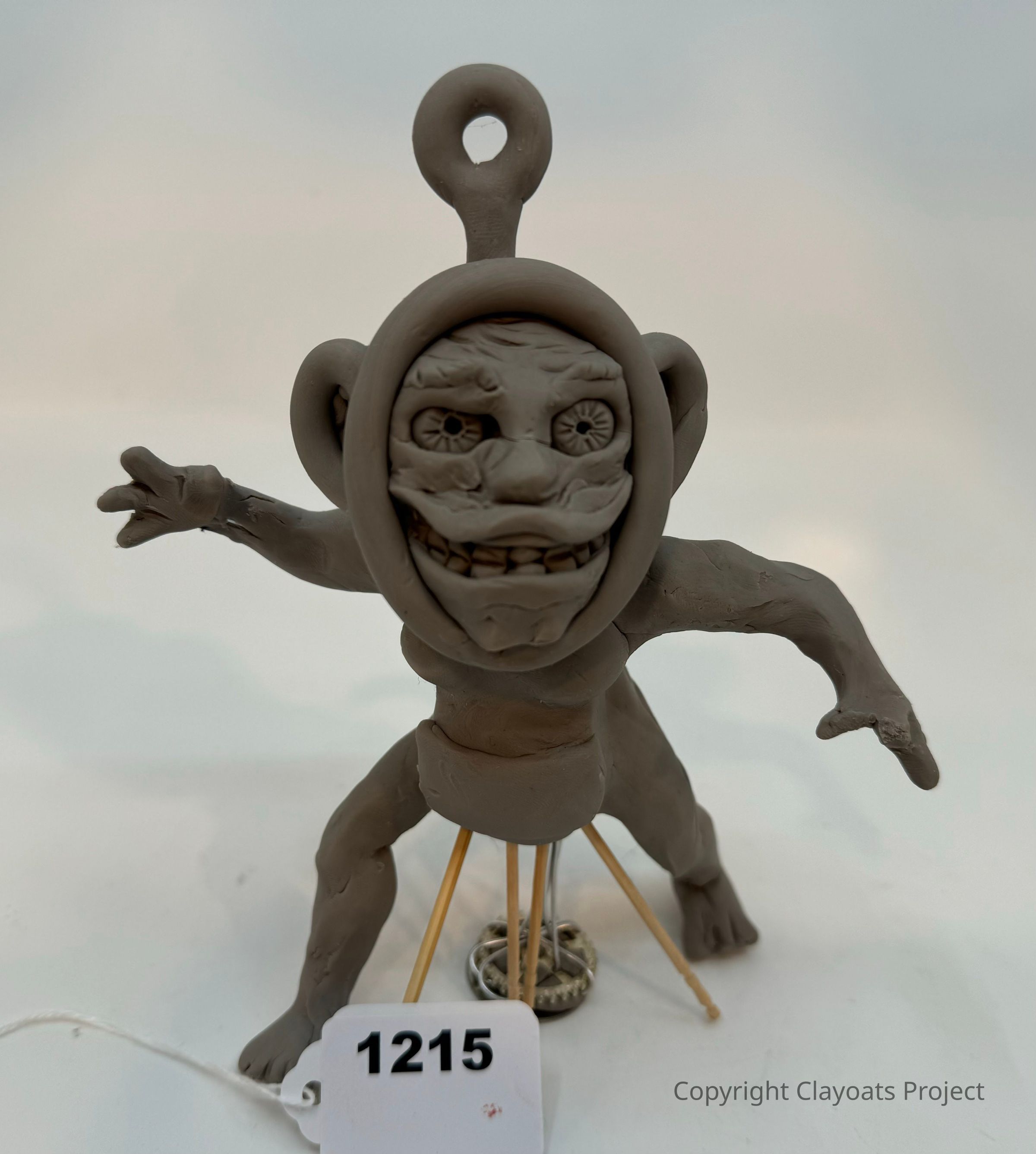 The image shows a quirky clay figurine on display, featuring an expressive face with large eyes and a wide grin. Its head is circular with a loop on top, reminiscent of an antenna or handle, and its outstretched arms suggest dynamic movement. The body has a humanoid shape with exaggerated features, including long limbs and a mischievously comic expression. It stands on a makeshift base supported by thin rods, resting on a small circular platform. A white tag with the number "1215