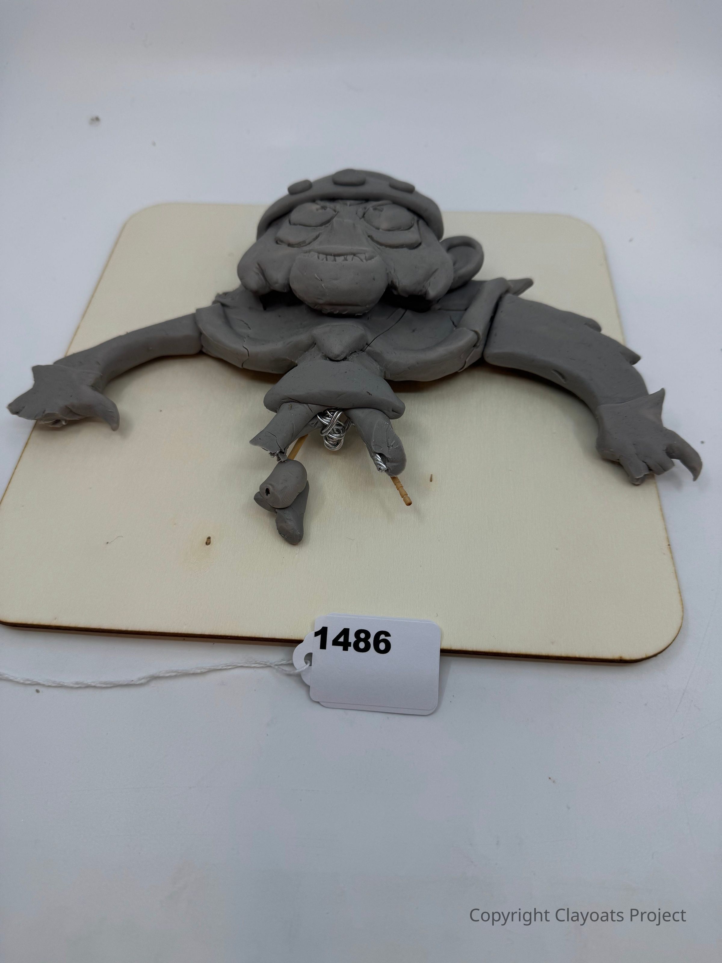 The image shows a clay model of a cartoonish character lying on a flat wooden surface. This character appears to have exaggerated facial features, large eyes, and a prominent, rounded nose. Its arms are extended with three visible fingers on each hand. The legs are small and connected by visible wire underneath. The clay model is mostly gray in color and shows some cracks in its surface.