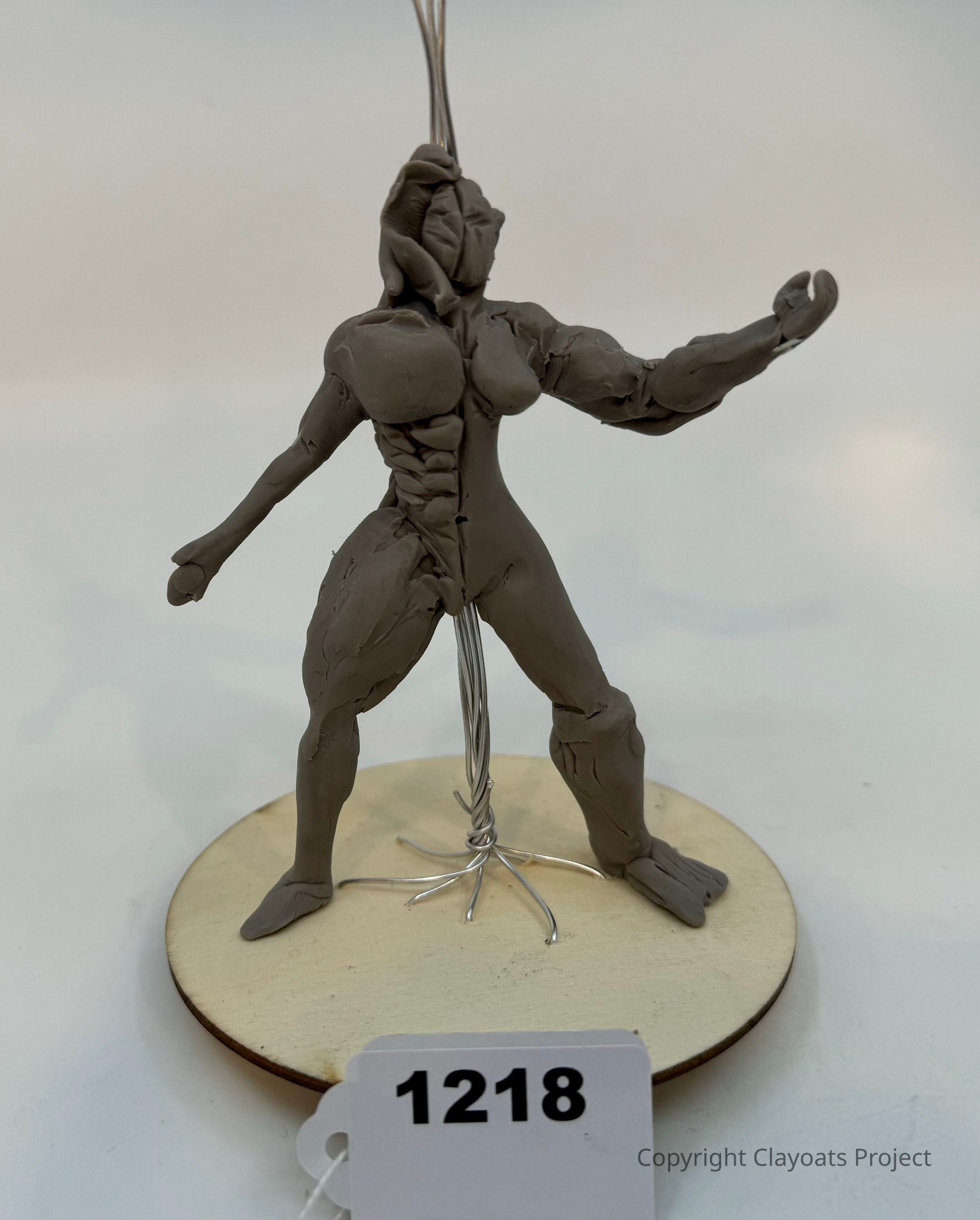 The image shows a clay sculpture of a humanoid figure, standing with one arm raised and bent at the elbow, mounted on a circular wooden base. The figure is detailed with muscular features and is supported by a metal wire framework extending from the base to the top. The facial features are not sharply defined, and the sculpture stands on feet that are shaped broadly to support its stance. In front of the base.