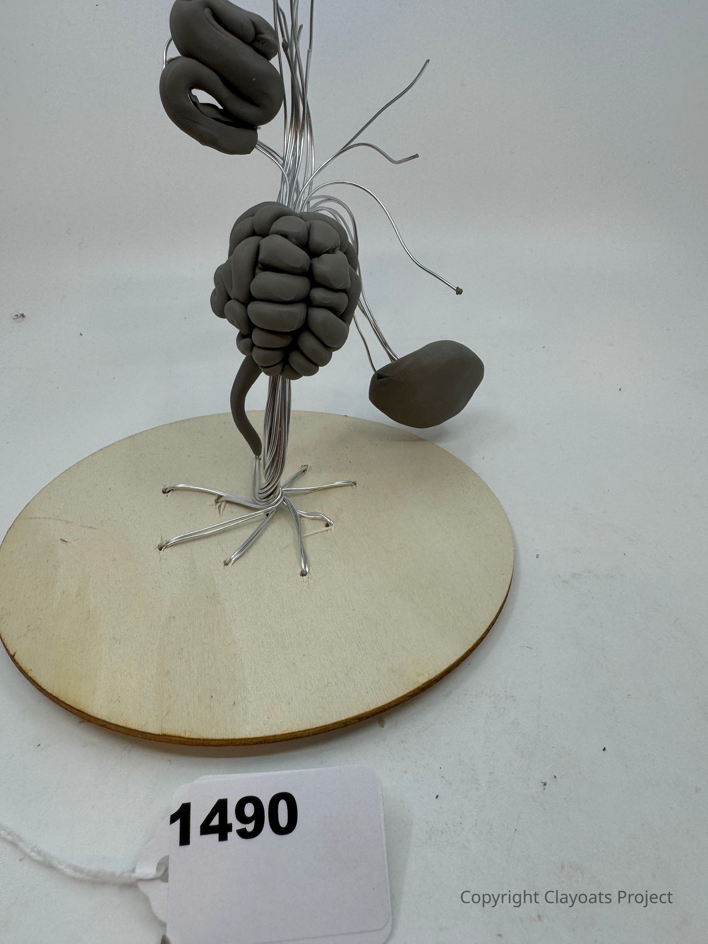The image showcases a creative sculpture mounted on a circular wooden base, featuring intertwined wires and clay components resembling abstract organic forms; a coiled shape is positioned above a clustered formation, with several wire extensions branching out, adding a dynamic element to the piece.