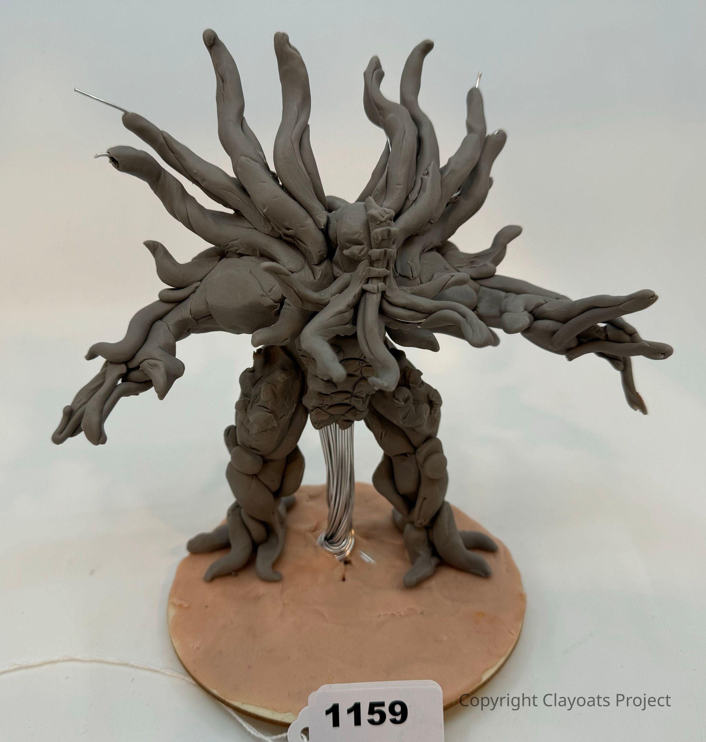 The image depicts a unique sculpture created with grey clay, featuring a creature with numerous elongated, tentacle-like appendages radiating from its body. The figure stands on a round base, and metal wires are visible underneath its body, suggesting structural support. The organic, fluid design of the tentacles gives it an otherworldly appearance.